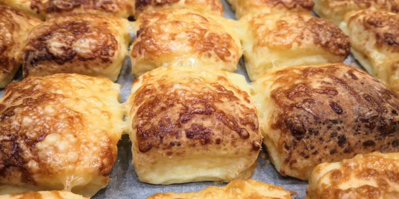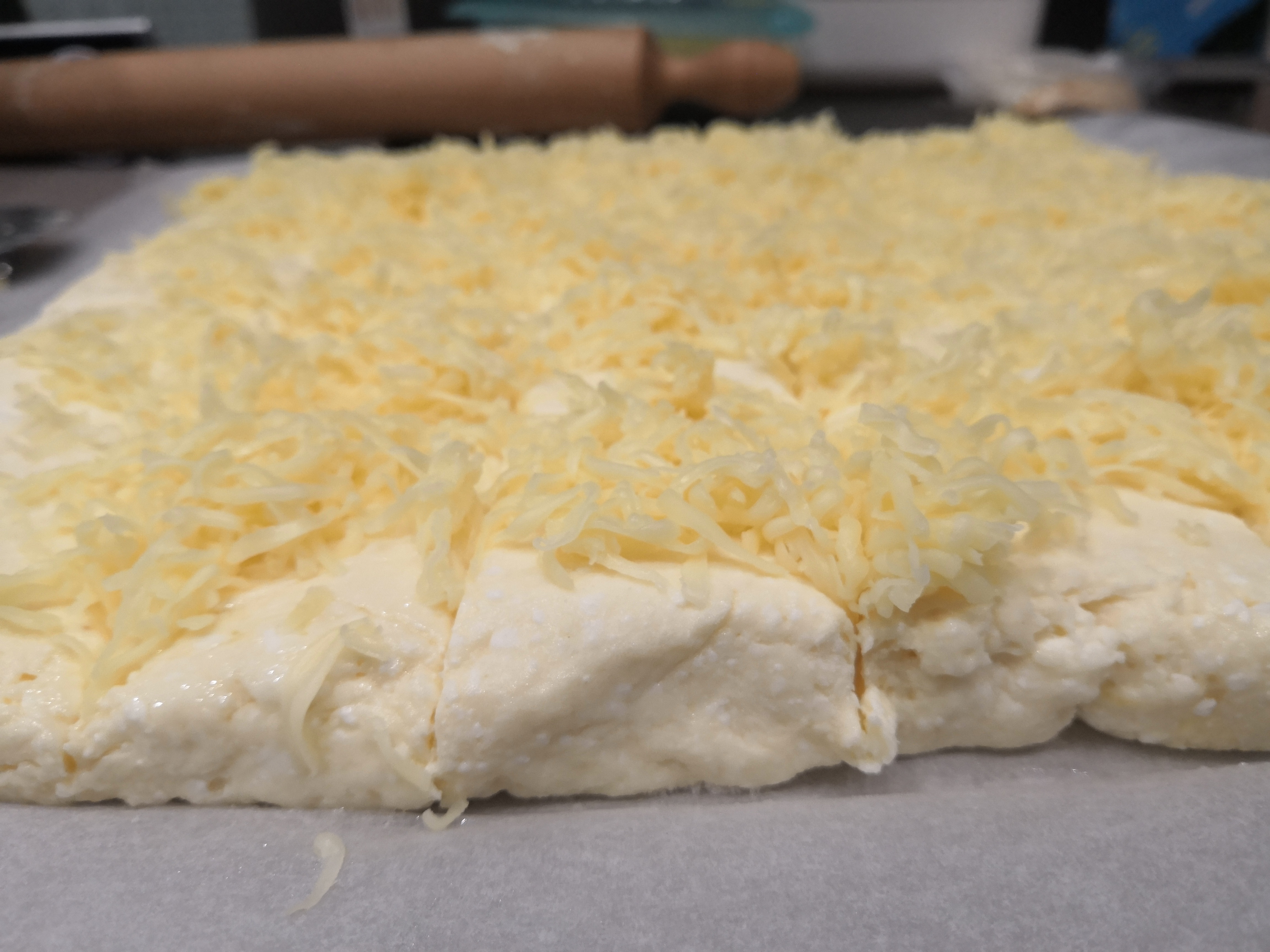 - Kb 1,5 cm vastag téglalapot nyújtunk belőle, megkenjük tojásfehérjével és megszórjuk sajttal