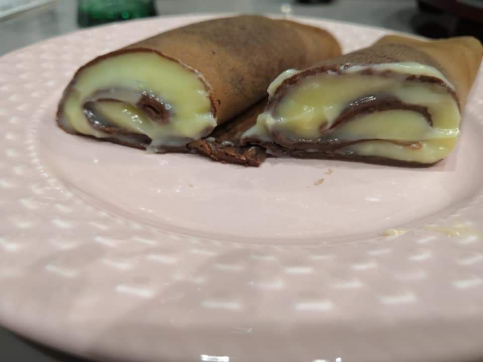 A kakaós palacsintát (szerintem kakacsinta, Sára szerint viszont abszolút nem vicces név neki😁), vanília pudingos krémmel töltöttem meg.
