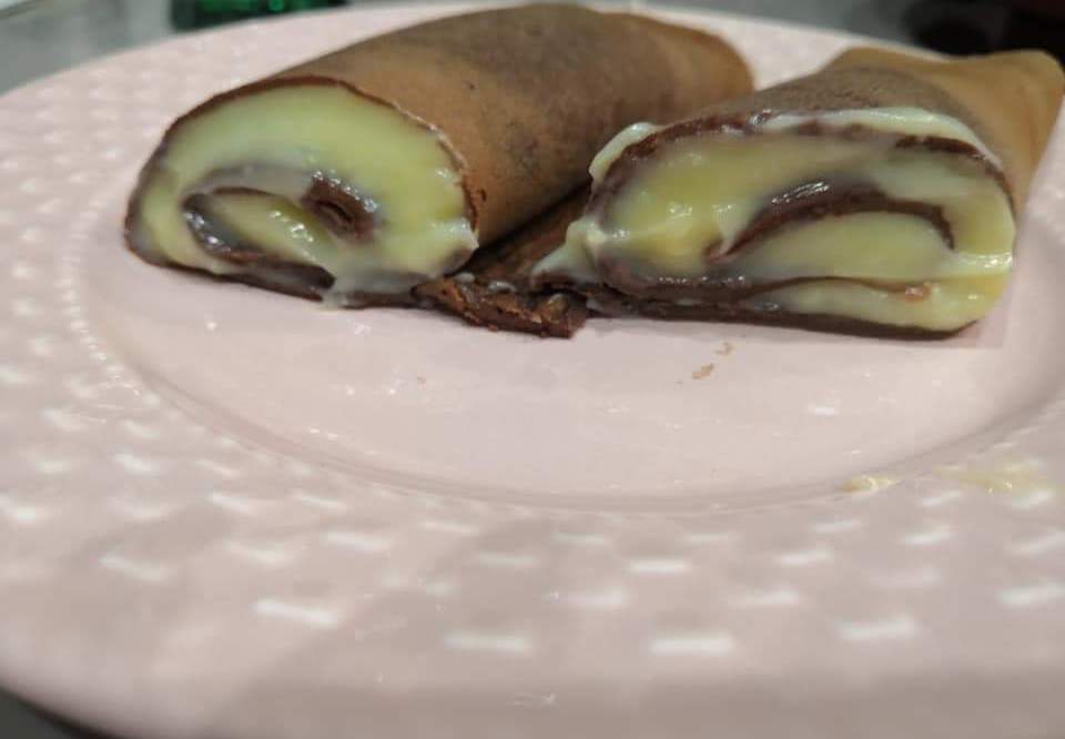 A kakaós palacsintát (szerintem kakacsinta, Sára szerint viszont abszolút nem vicces név neki😁), vanília pudingos krémmel töltöttem meg.