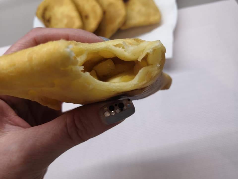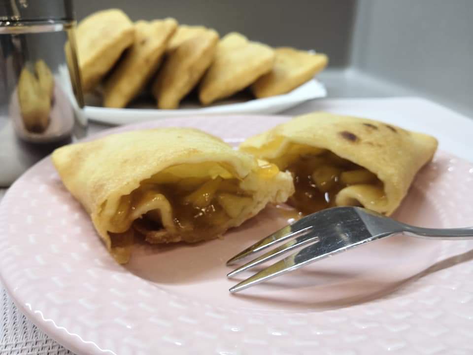 - Tegyünk a kinyújtott tésztára 2 evőkanál tölteléket, a szélét vékonyan kenjük le vízzel.