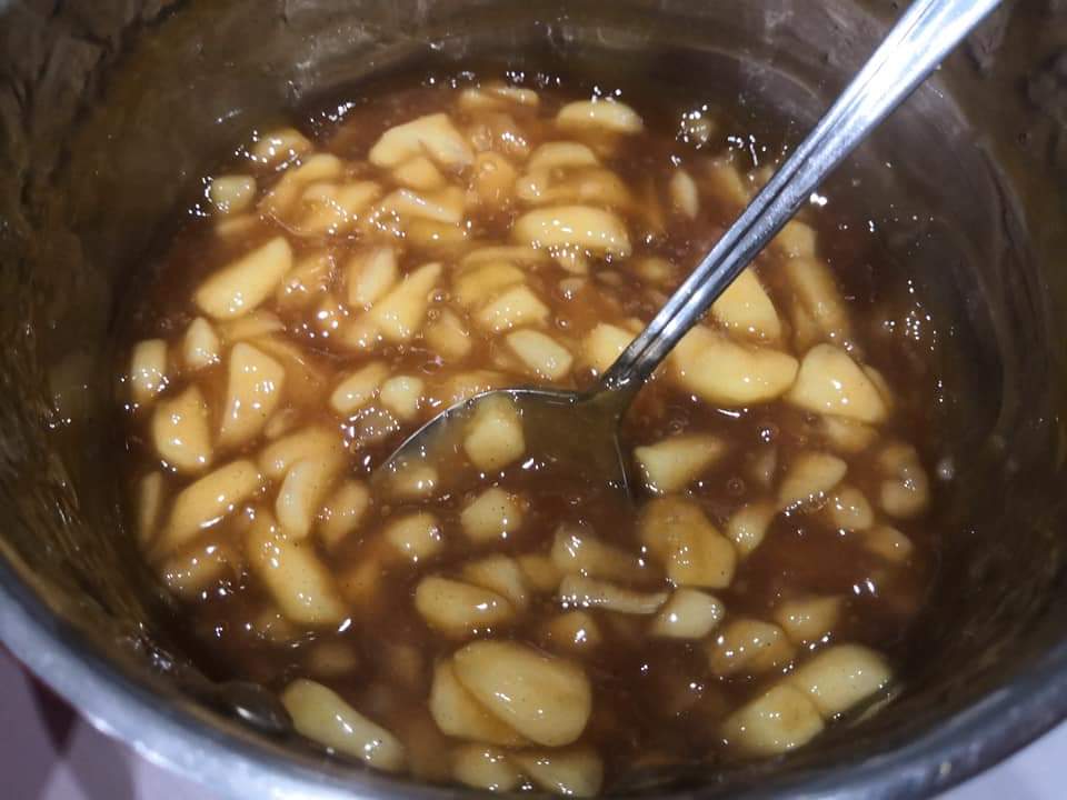 - Töltelék: az almát megpucoljuk és apró kockákra vágjuk. A víz felével, 100 ml-rel és a cukorral tegyük fel főni. Ha felforr, 1-2 perc forralás után öntsük hozzá a maradék 100 ml víz, puding keveréket, ízesítsük fahéjjal és citrommal, és főzzük további 2 percet.