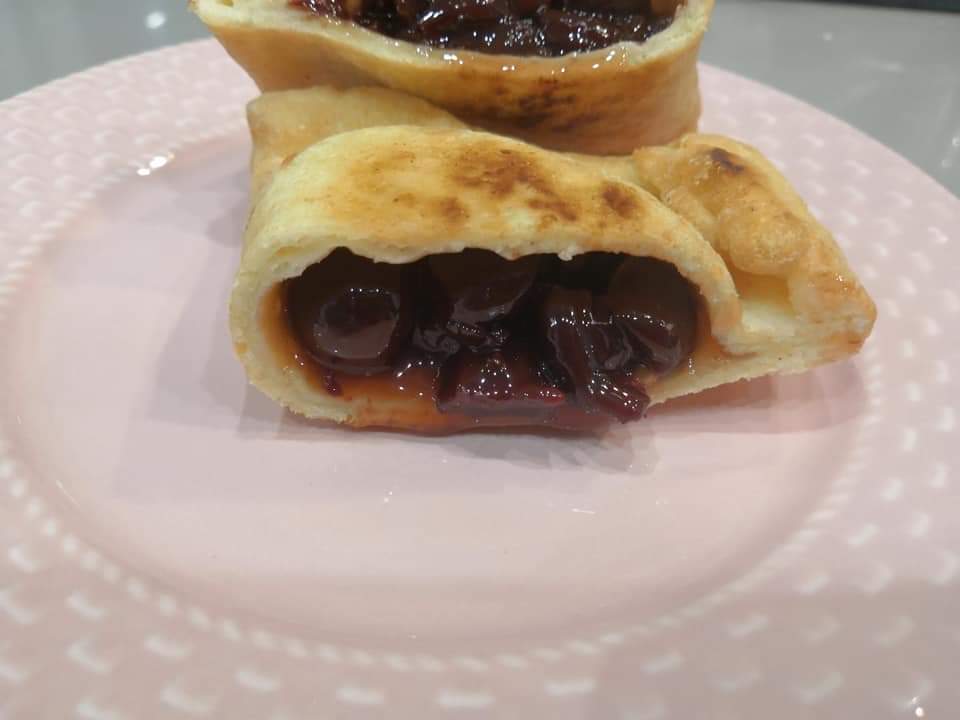 A tésztát naturbit alfa mix lisztből készítettem, 110 ml víz helyett 100 ml elég volt. A meggy befőttet vaníliás pudinggal főztem meg, kis fahéjjal és cukorral ízesítettem. Eszméletlen finom ebben a formában is 😉