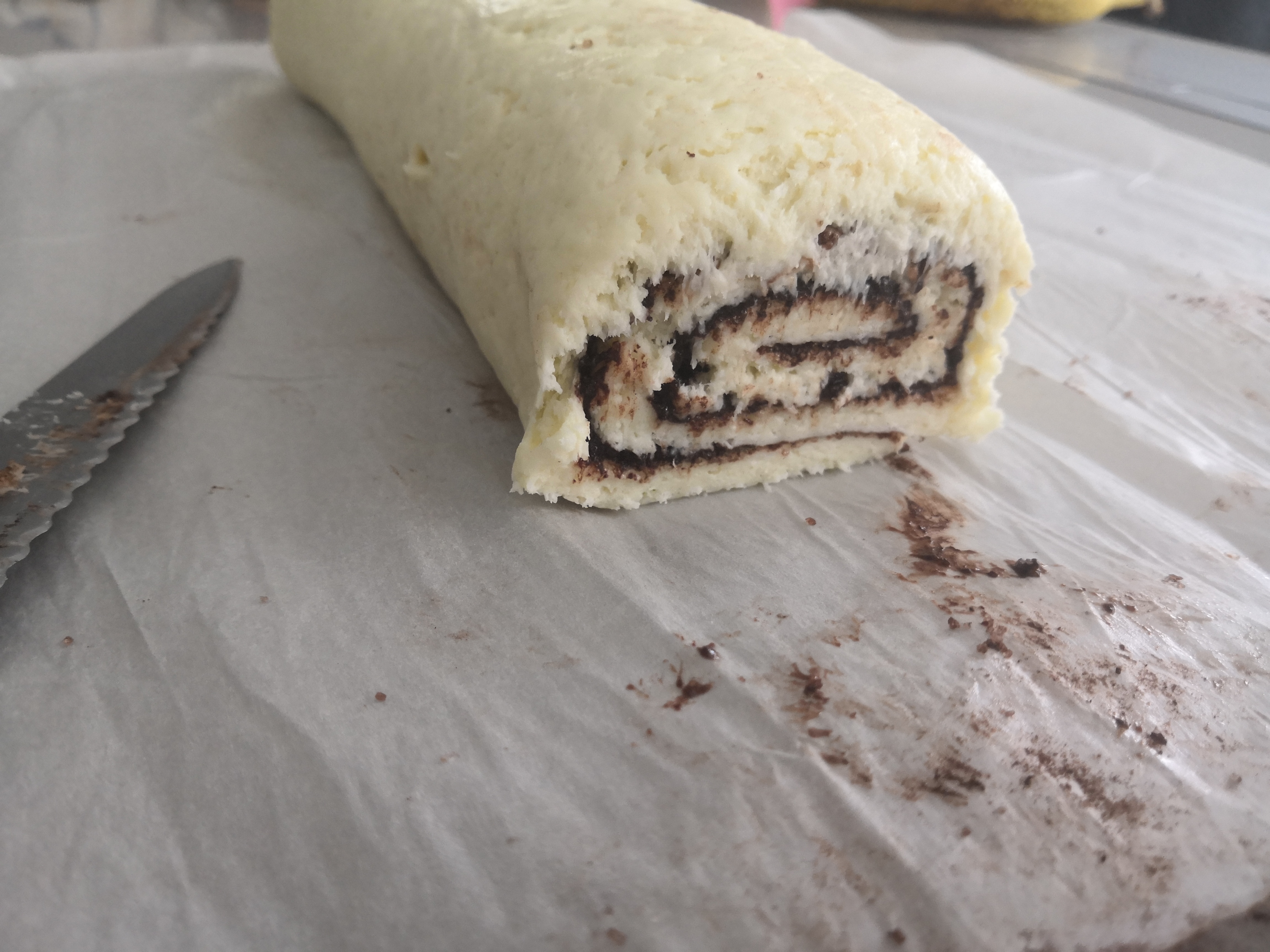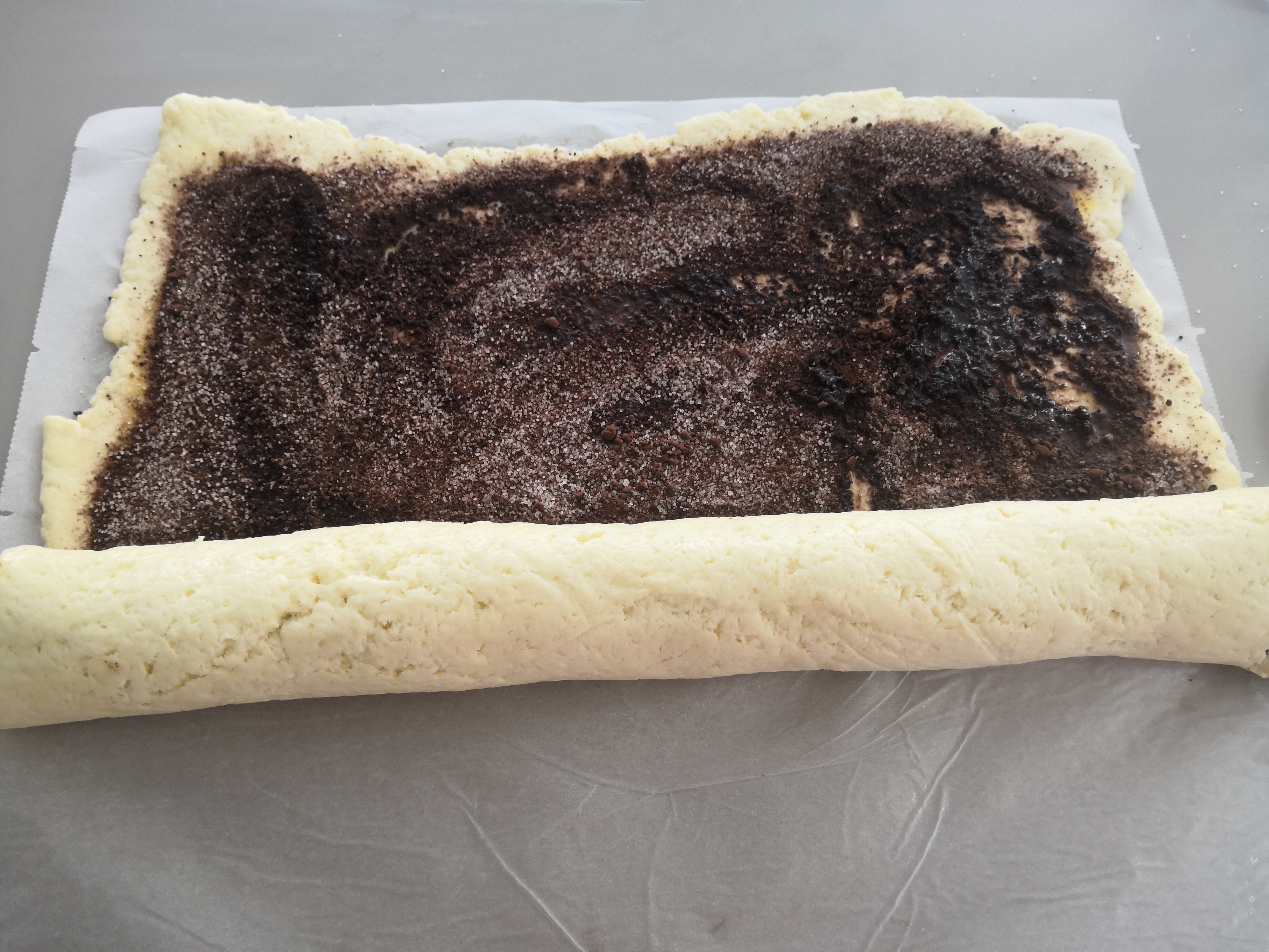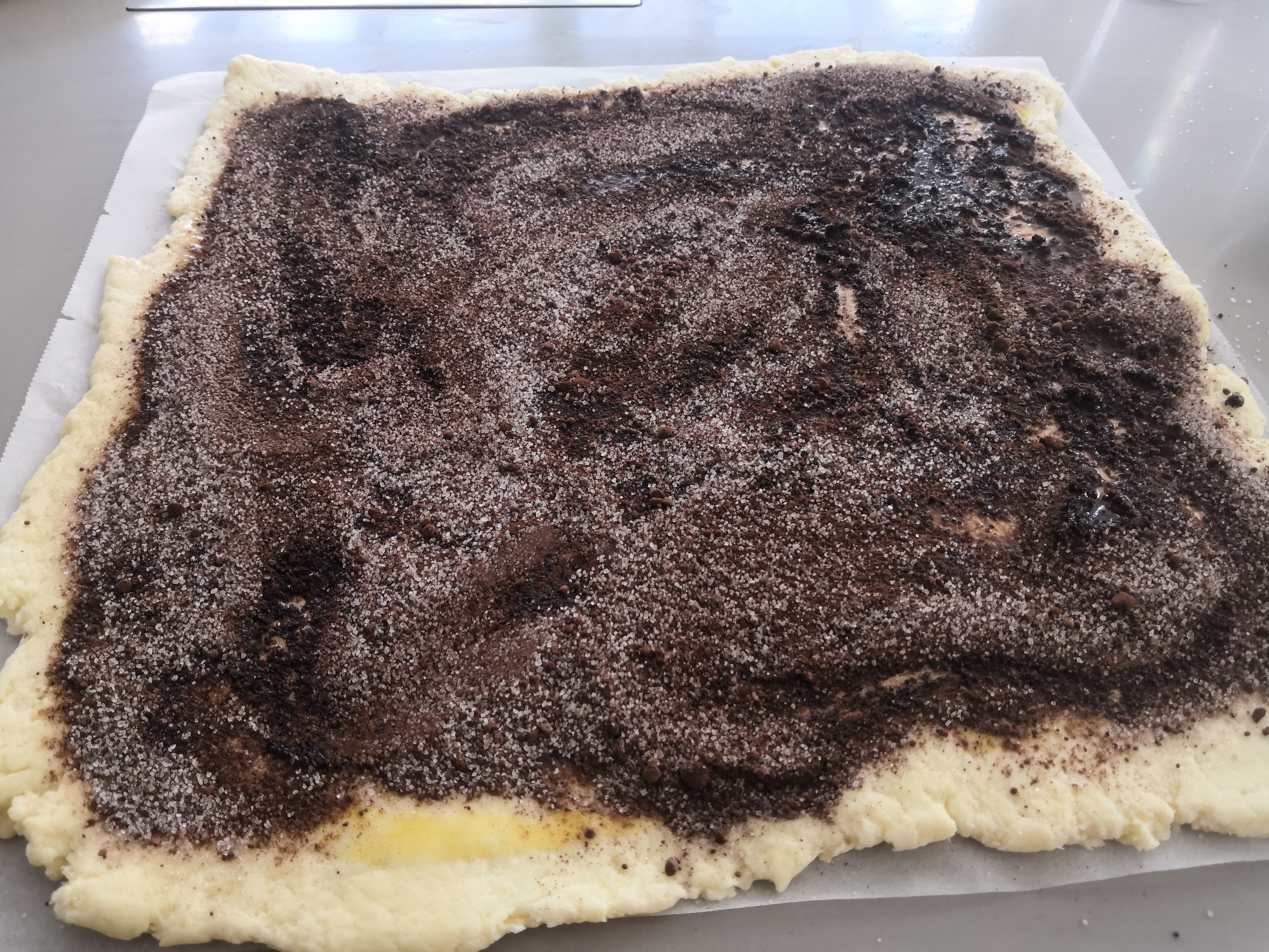- Kelesztés után kb 1 cm vastag téglalapot nyújtunk belőle, megkenjük az olvasztott margarinnal és megszórjuk a cukros kakaóval