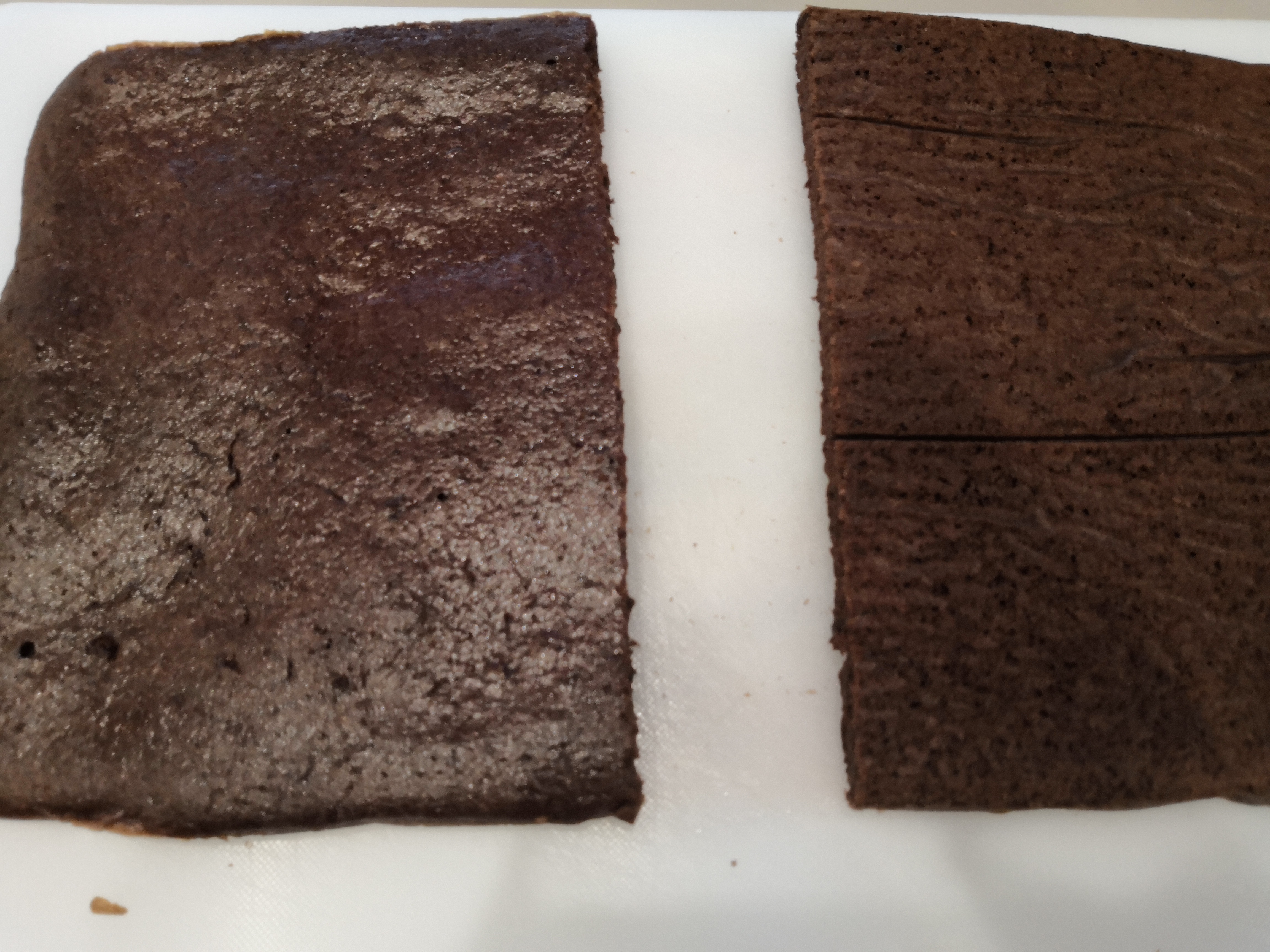 - Mivel ez egy vékony piskóta, a téglalap hosszabbik oldát vágjuk félbe