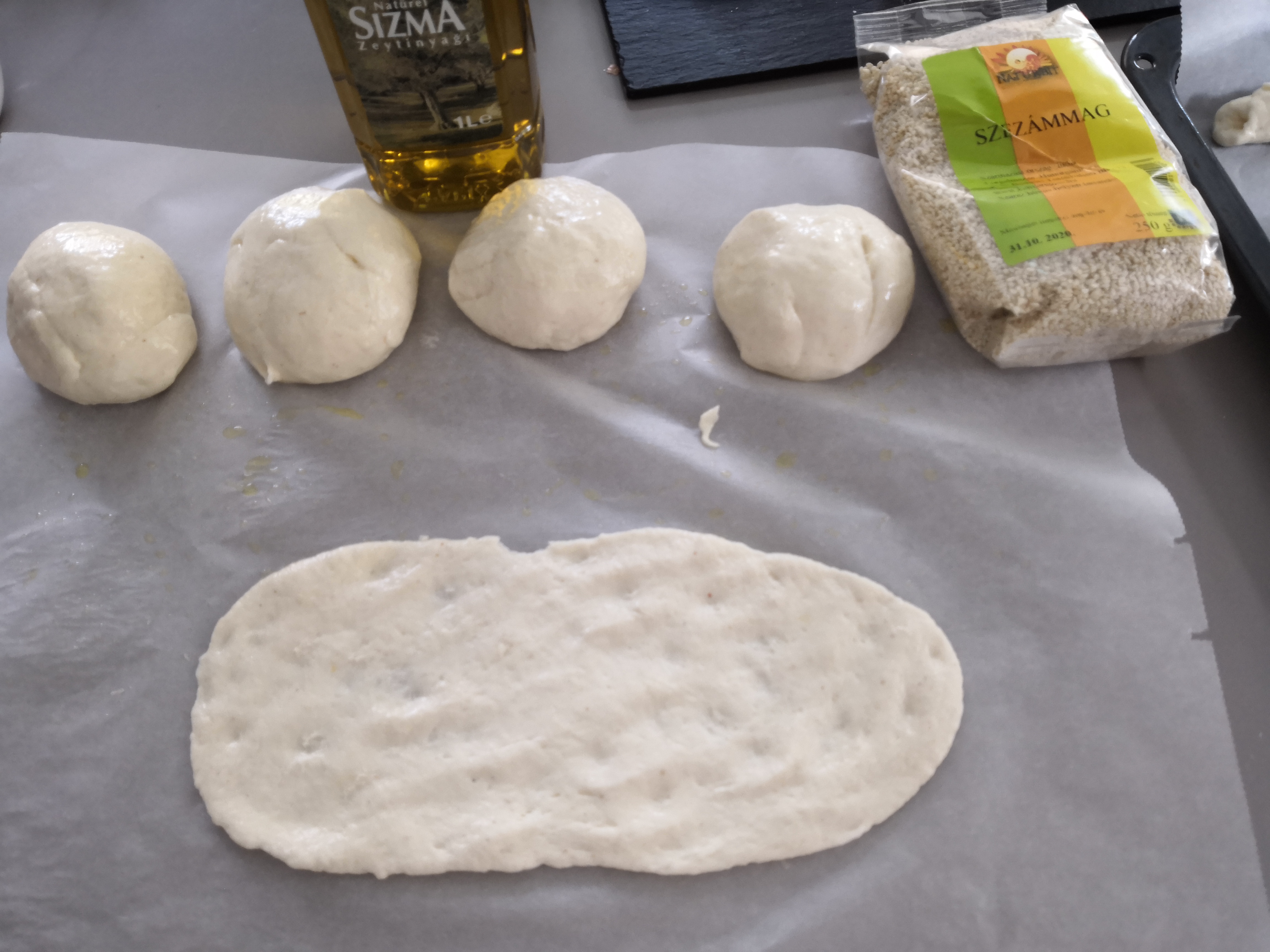 - A megformázott tésztát kenjük le olíva olajjal és szórjuk meg szezámmaggal.