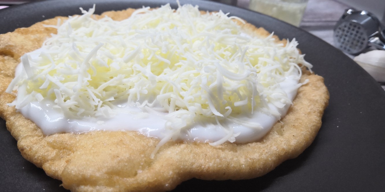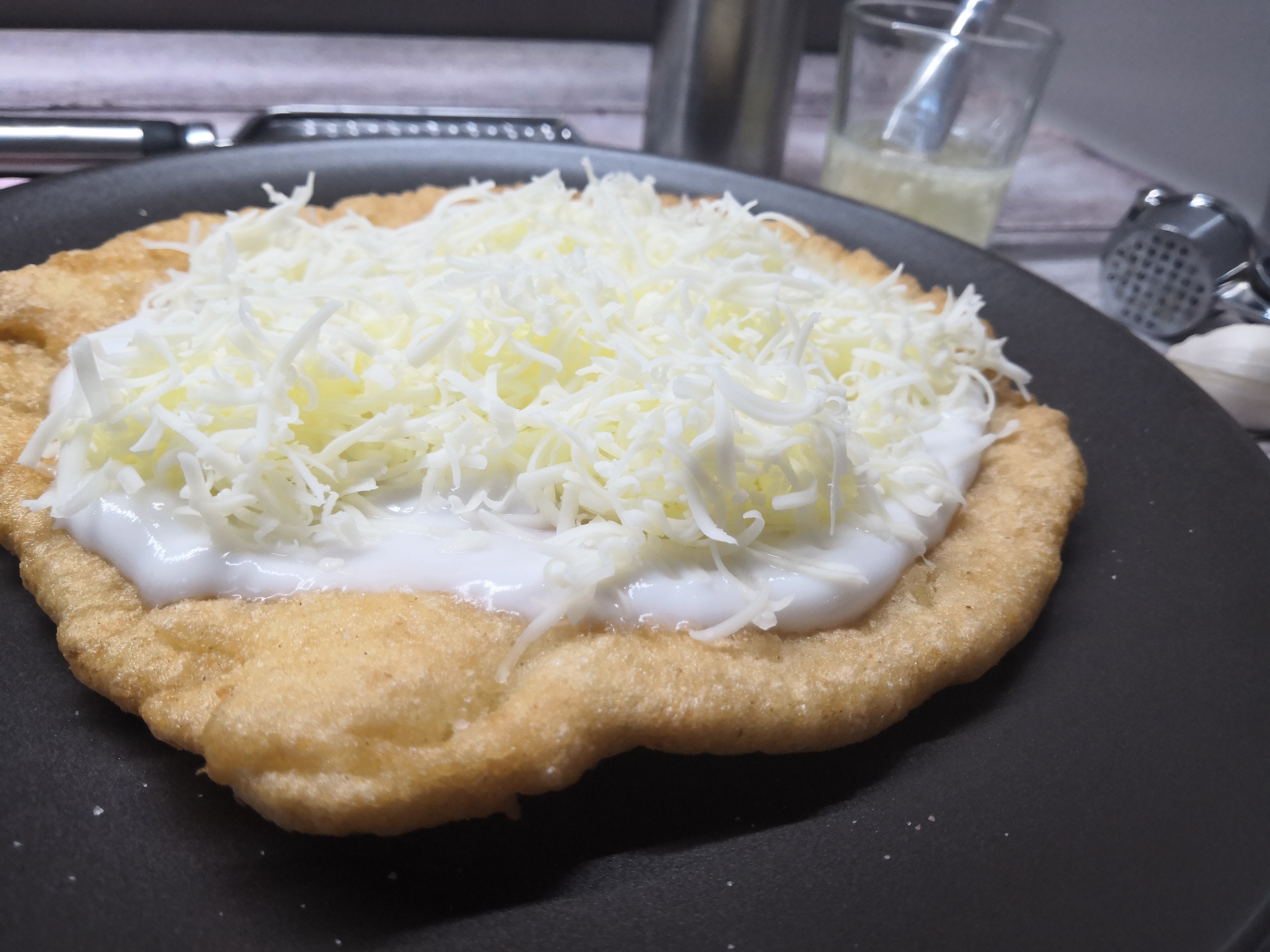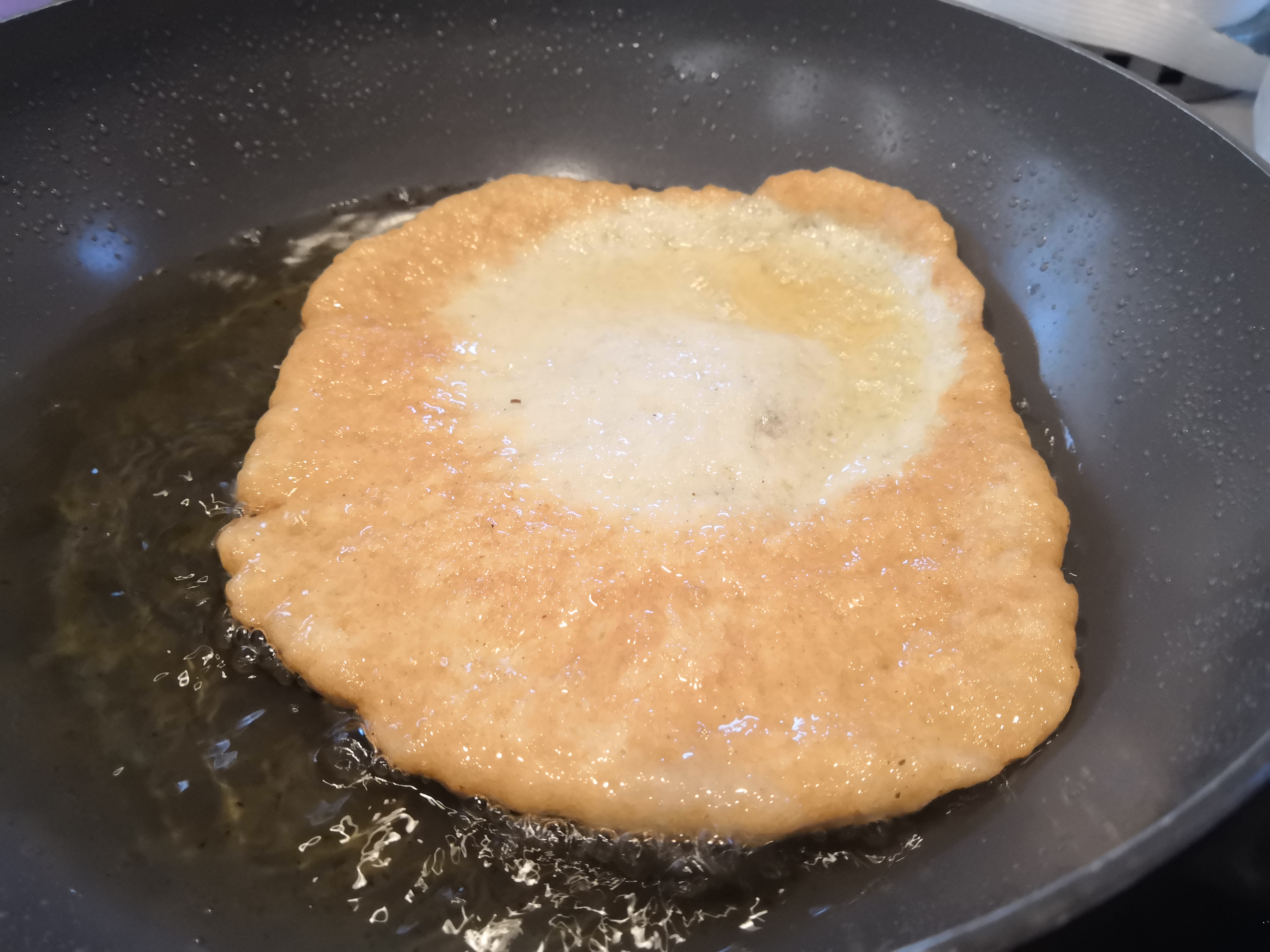 - A lángos tésztát olajos kézzel vékonyra lapítottam és forró olajban megsütöttem mindkét oldalát.