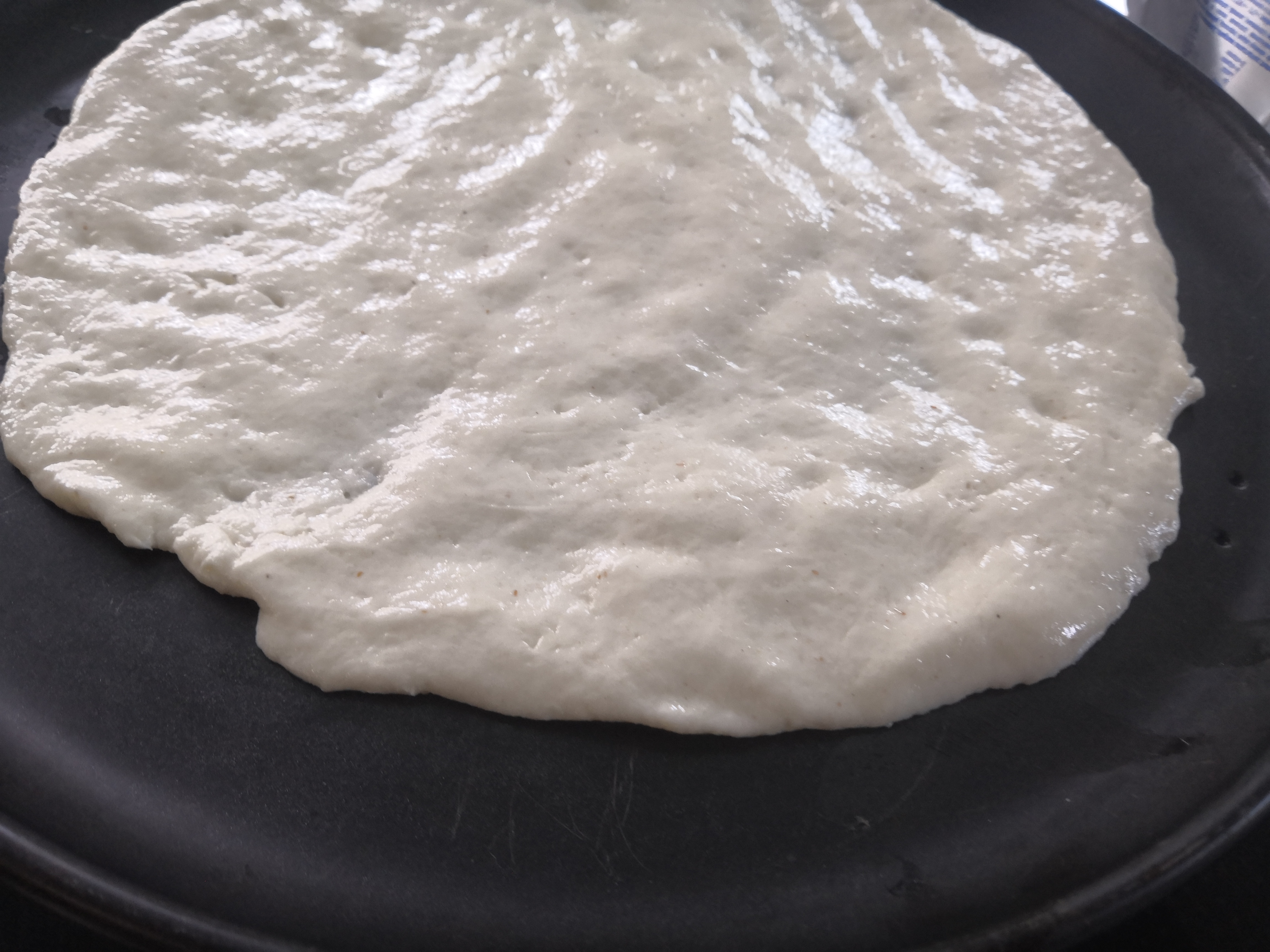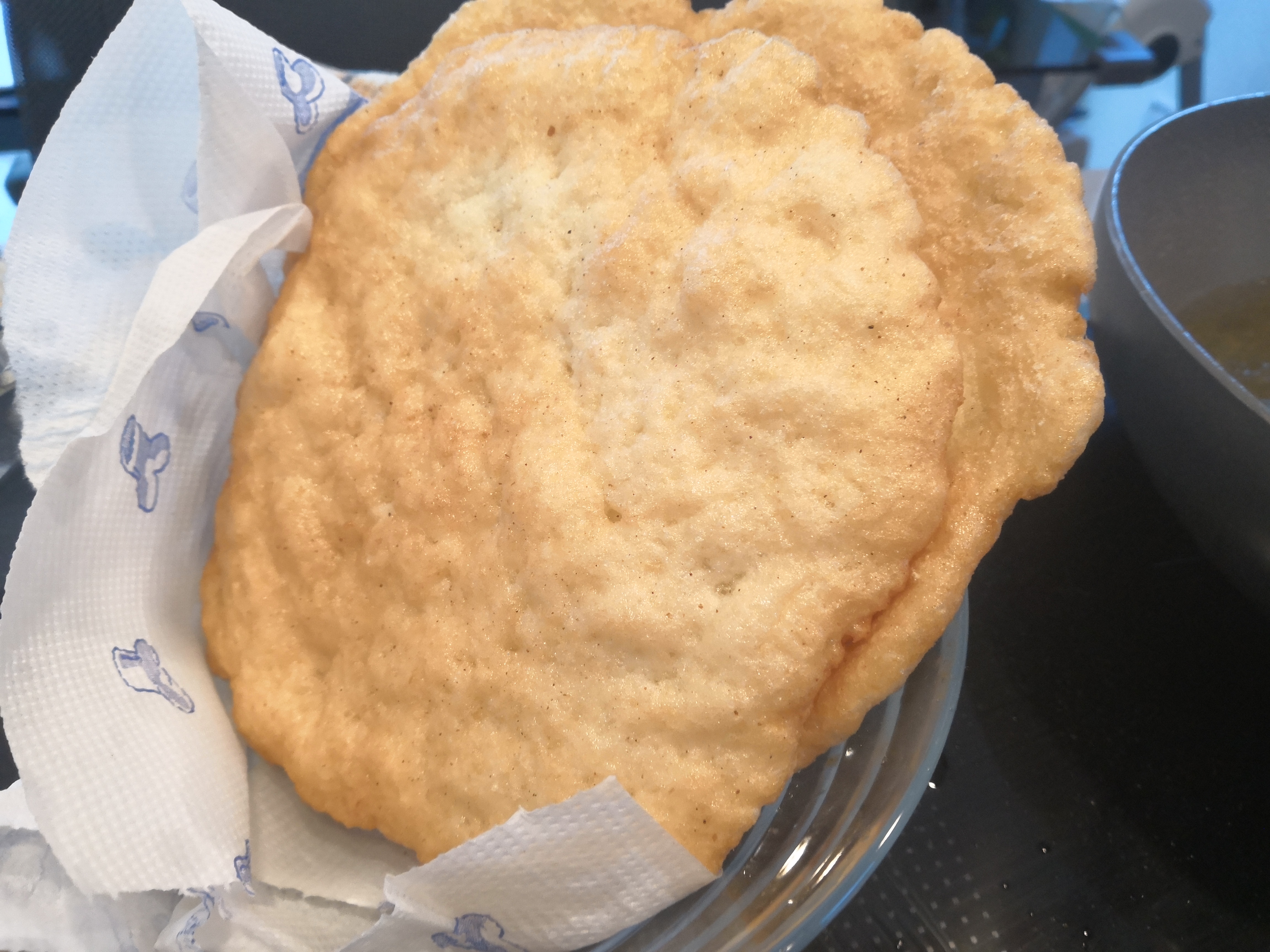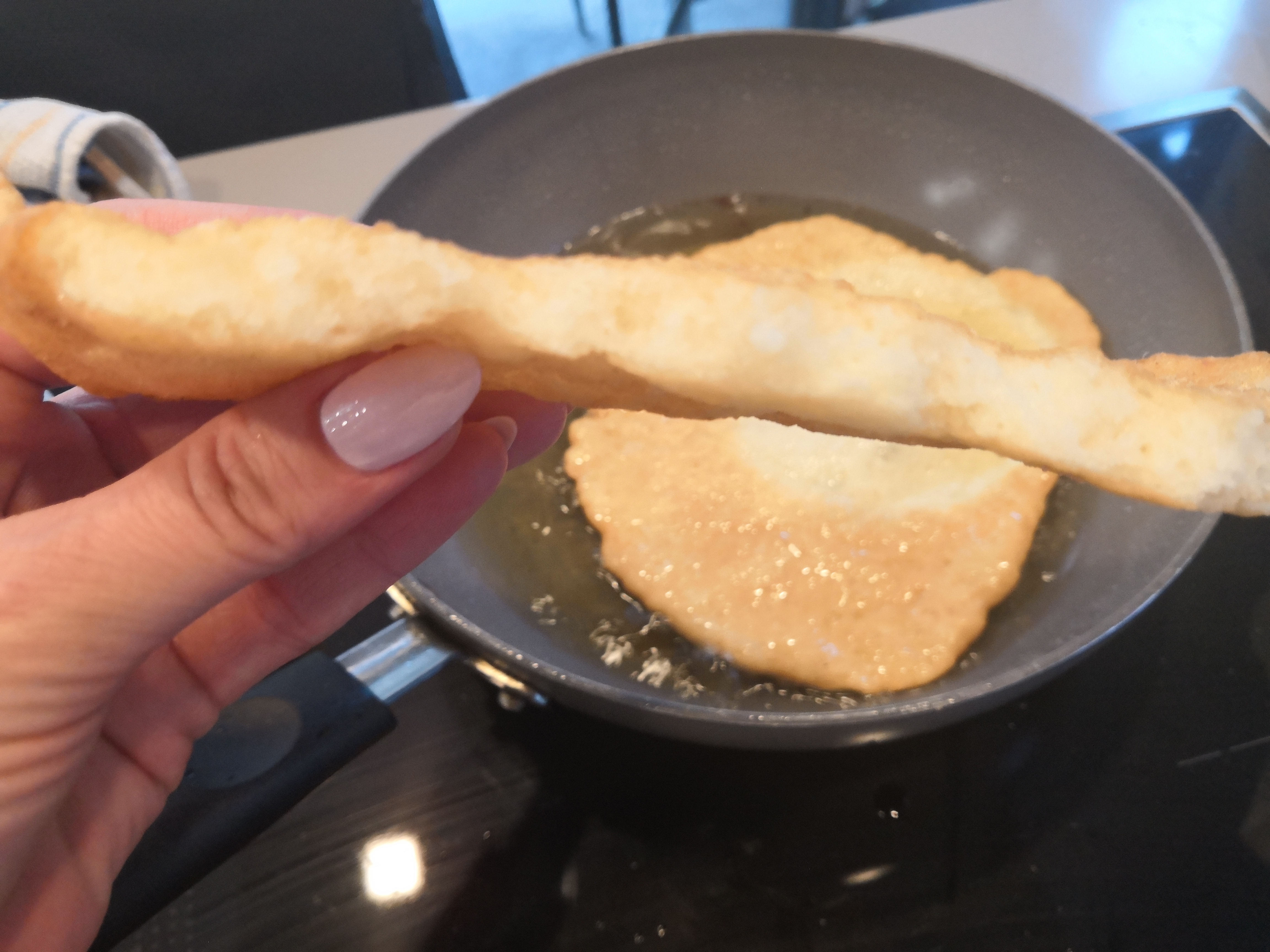 - A lángos tésztát olajos kézzel vékonyra lapítottam és forró olajban megsütöttem mindkét oldalát.