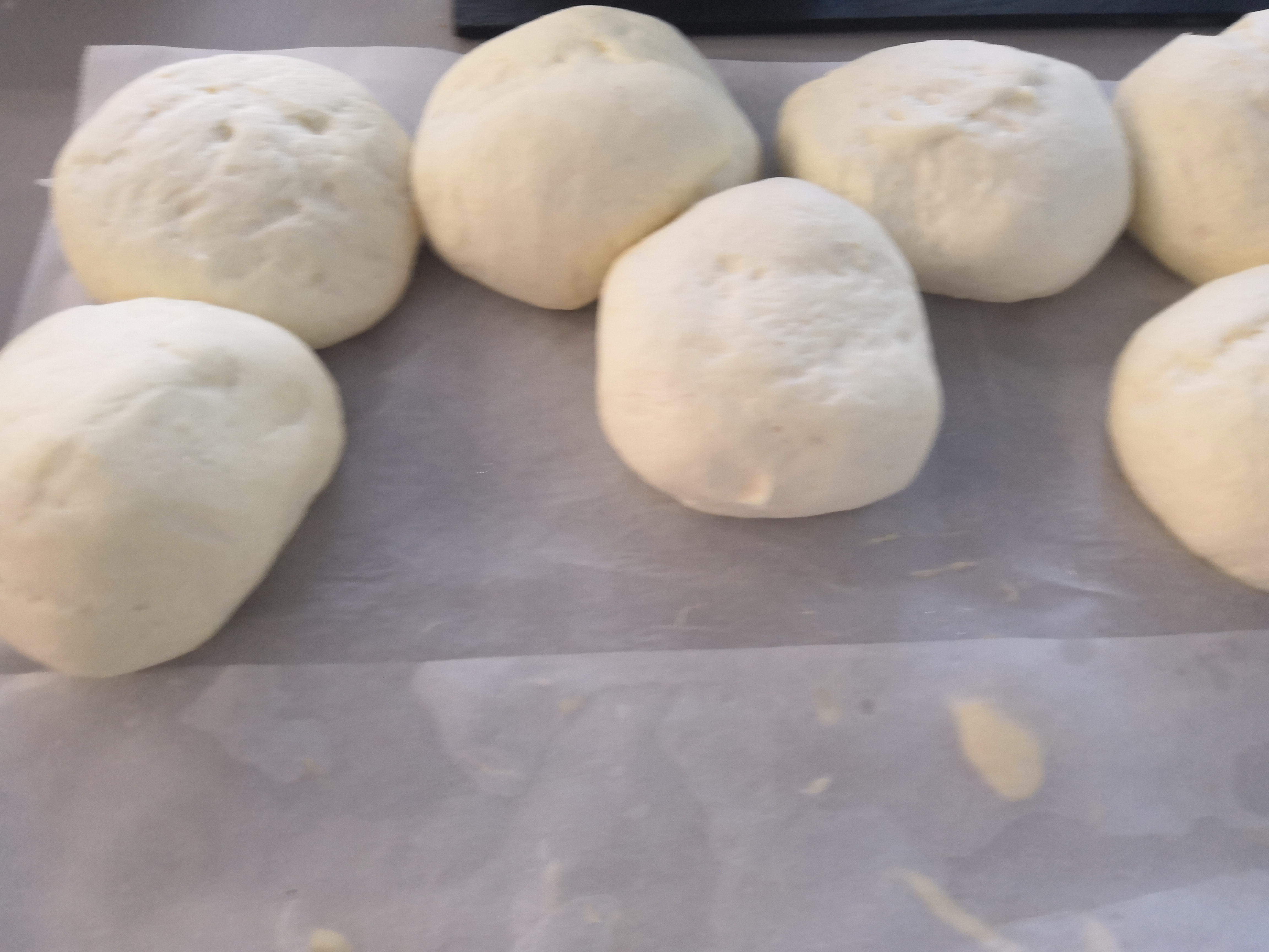 - 1 kb ököl nagyságú darabot kinyújtottam pizzának, a maradék bedagasztott tésztát pedig 7 egyenlő részre osztottam (ebből lesz a lángos)