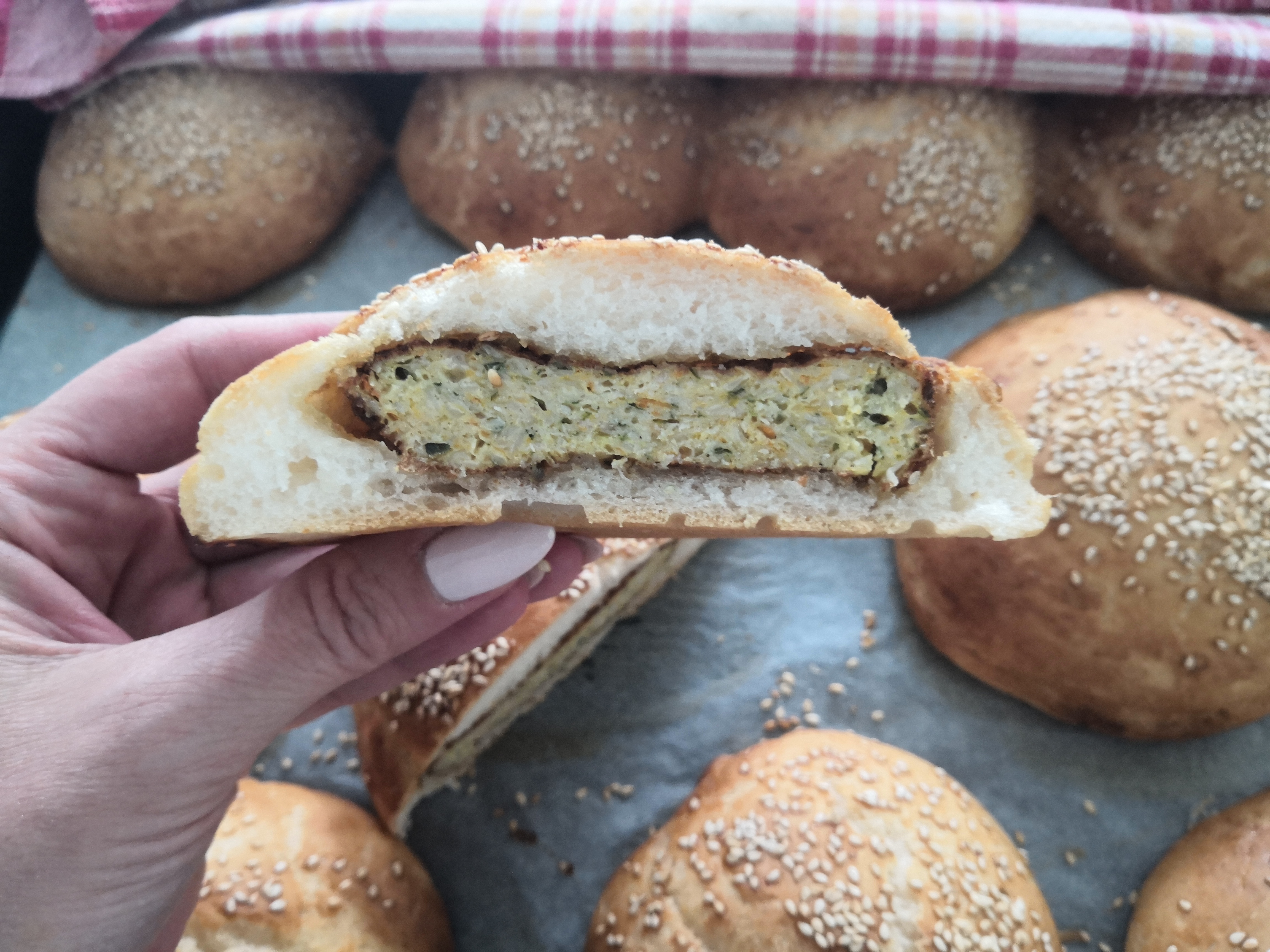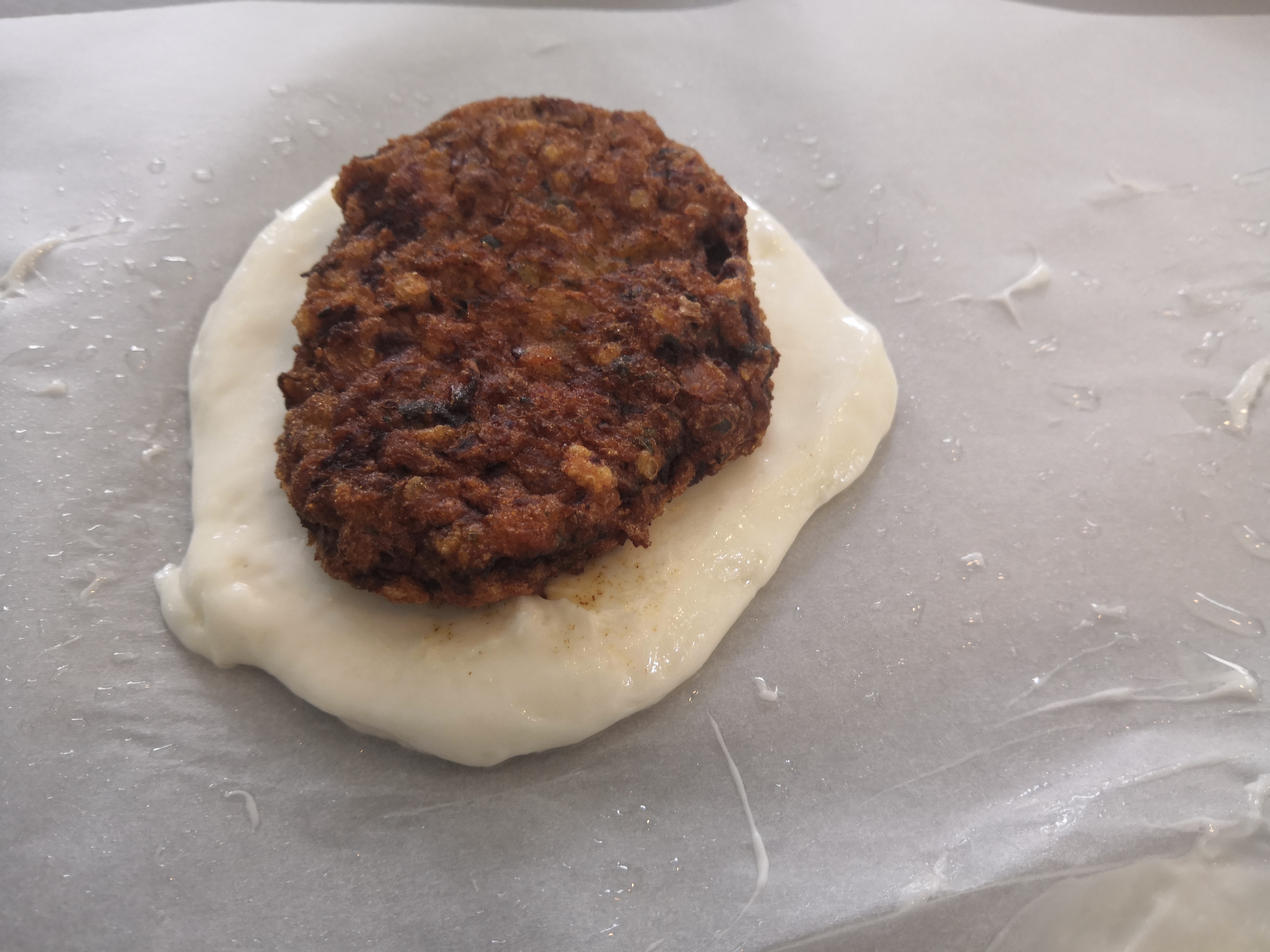 - A bucikat két részre osztjuk és kicsit kilapítjuk. Rátesszük a húspogácsát és a betakarjuk tésztával