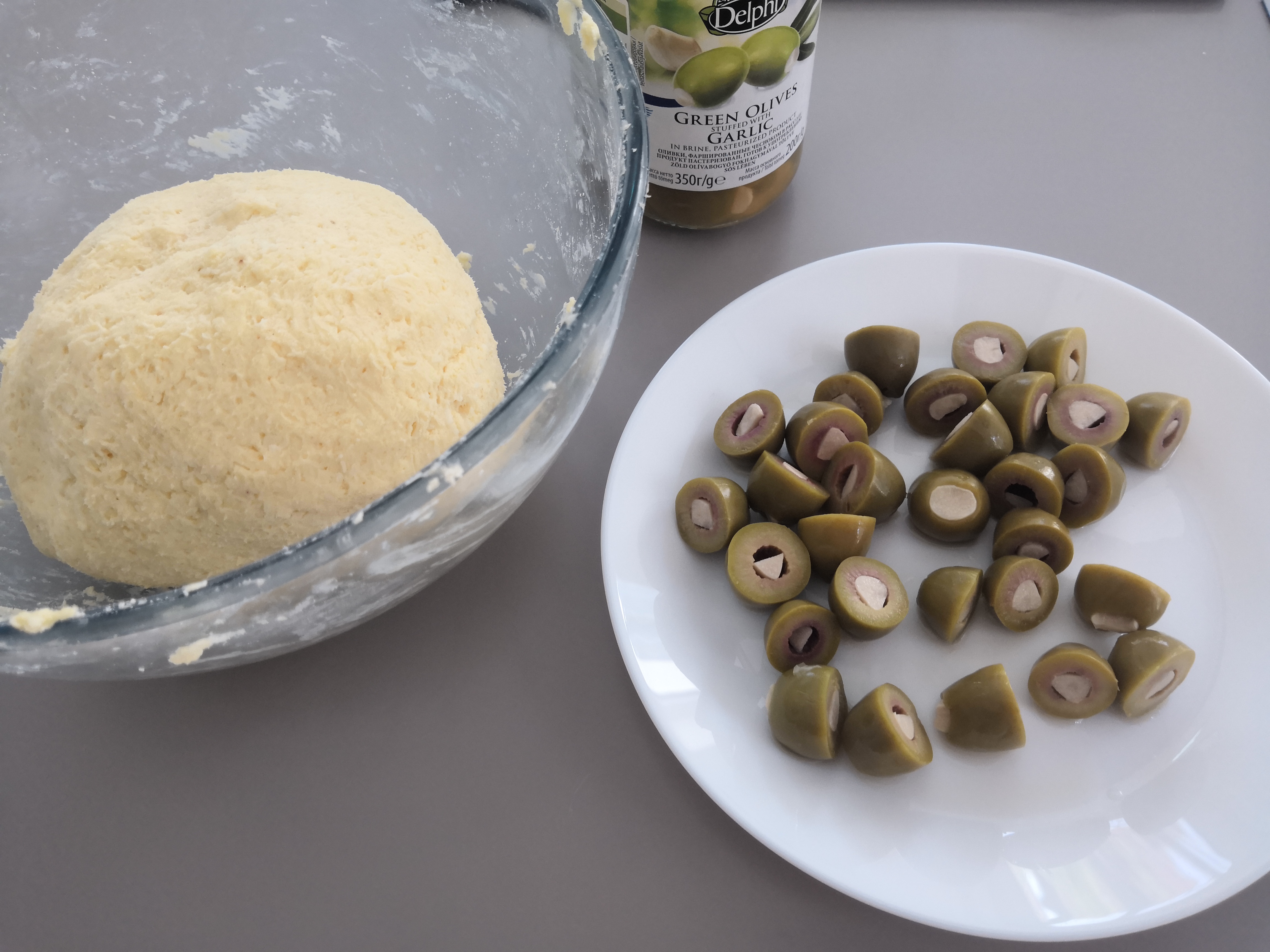 - félbevágott olíva bogyó (most fokhagymás)