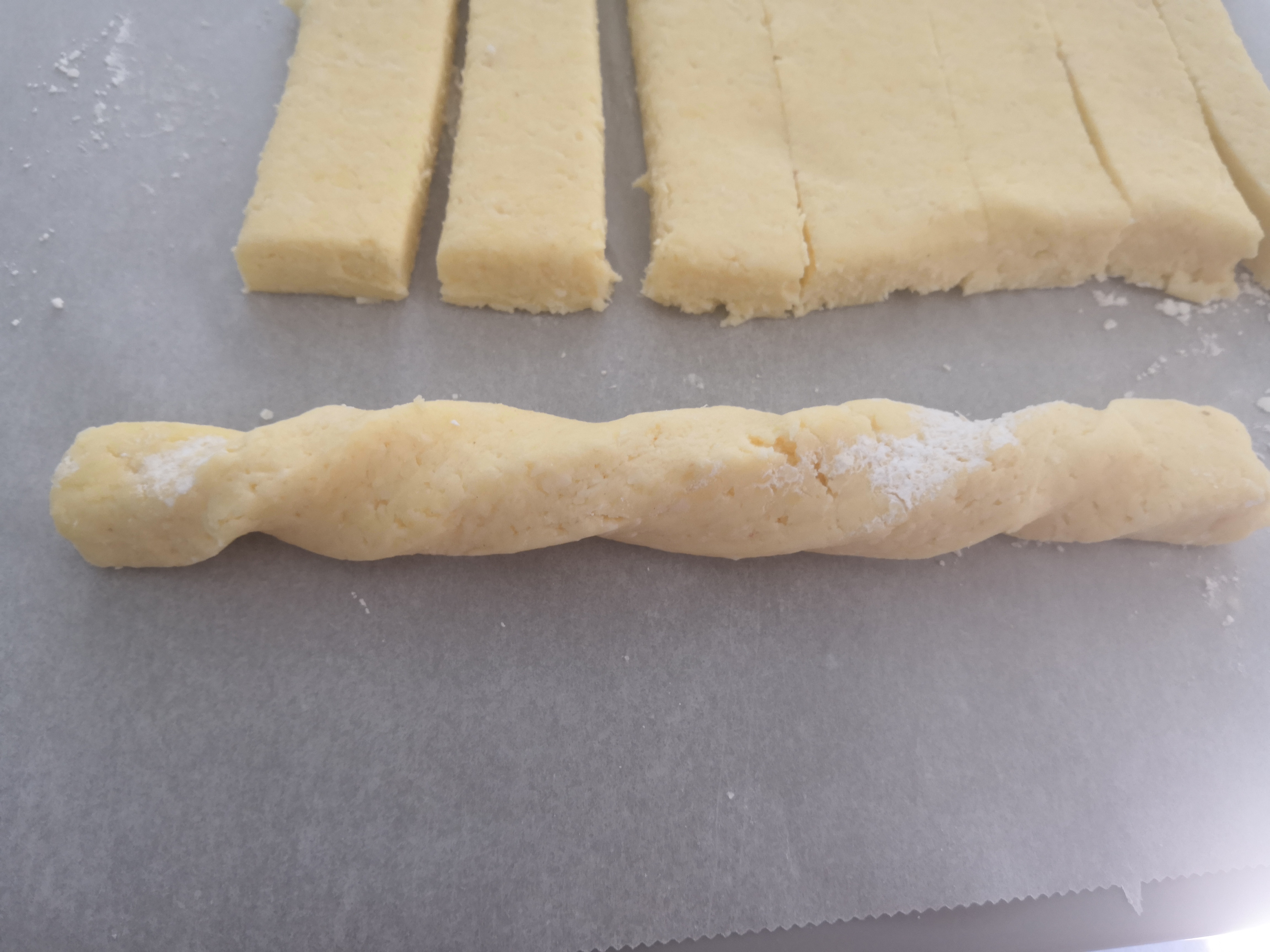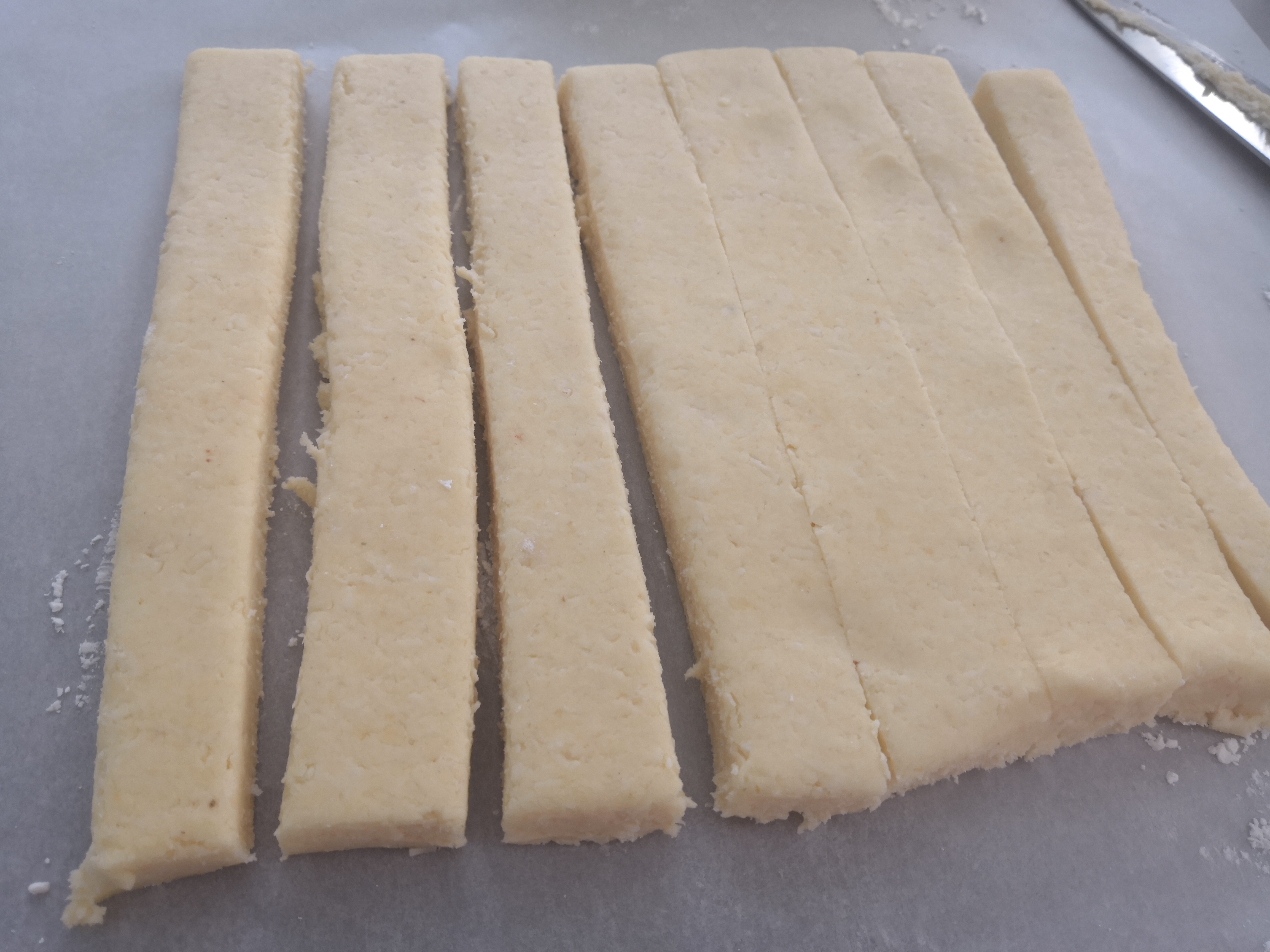 - Kb fél cm vastag téglalapot nyújtunk belőle és 1-1,5 cm-es csíkokat vágunk belőle