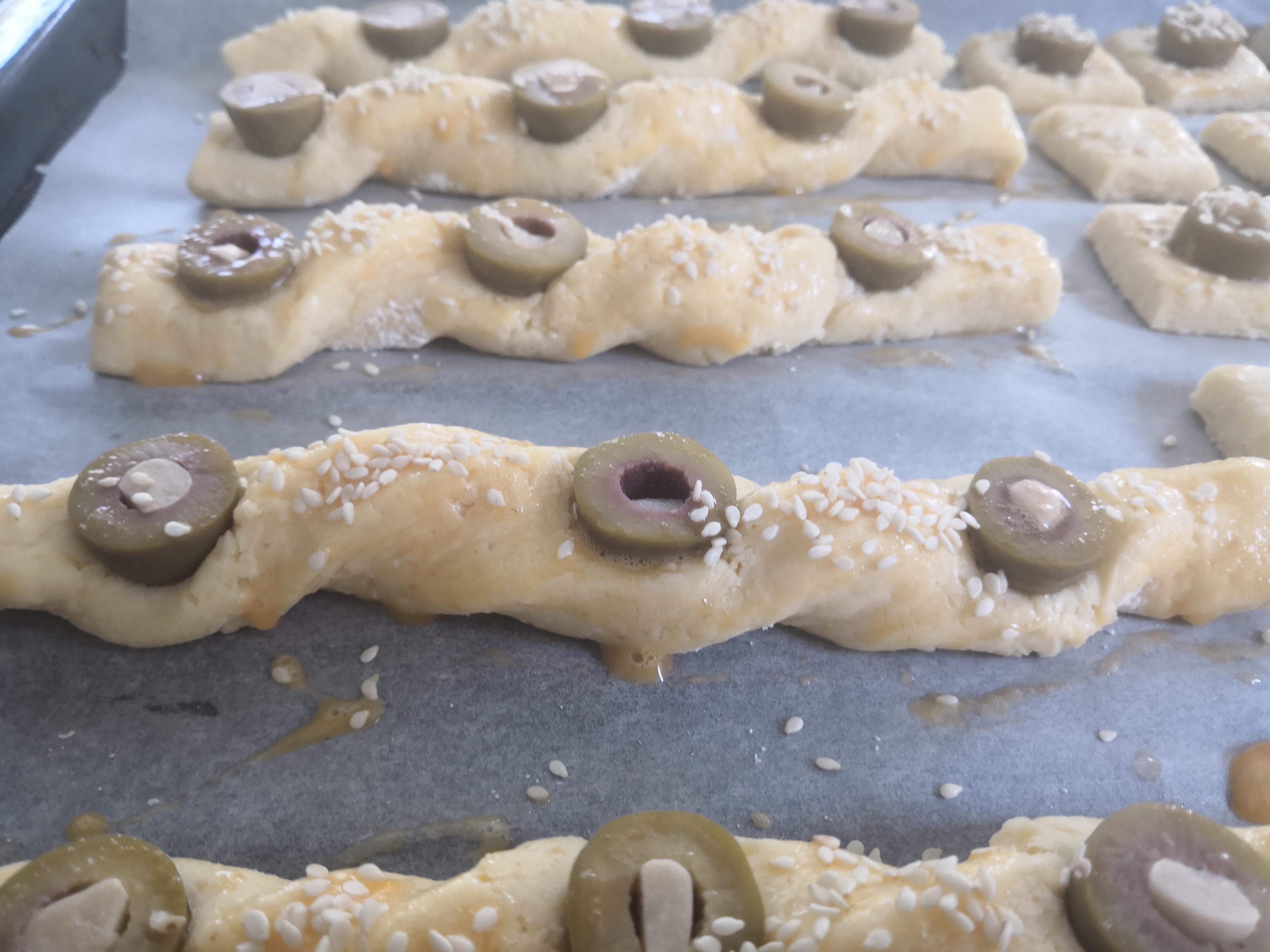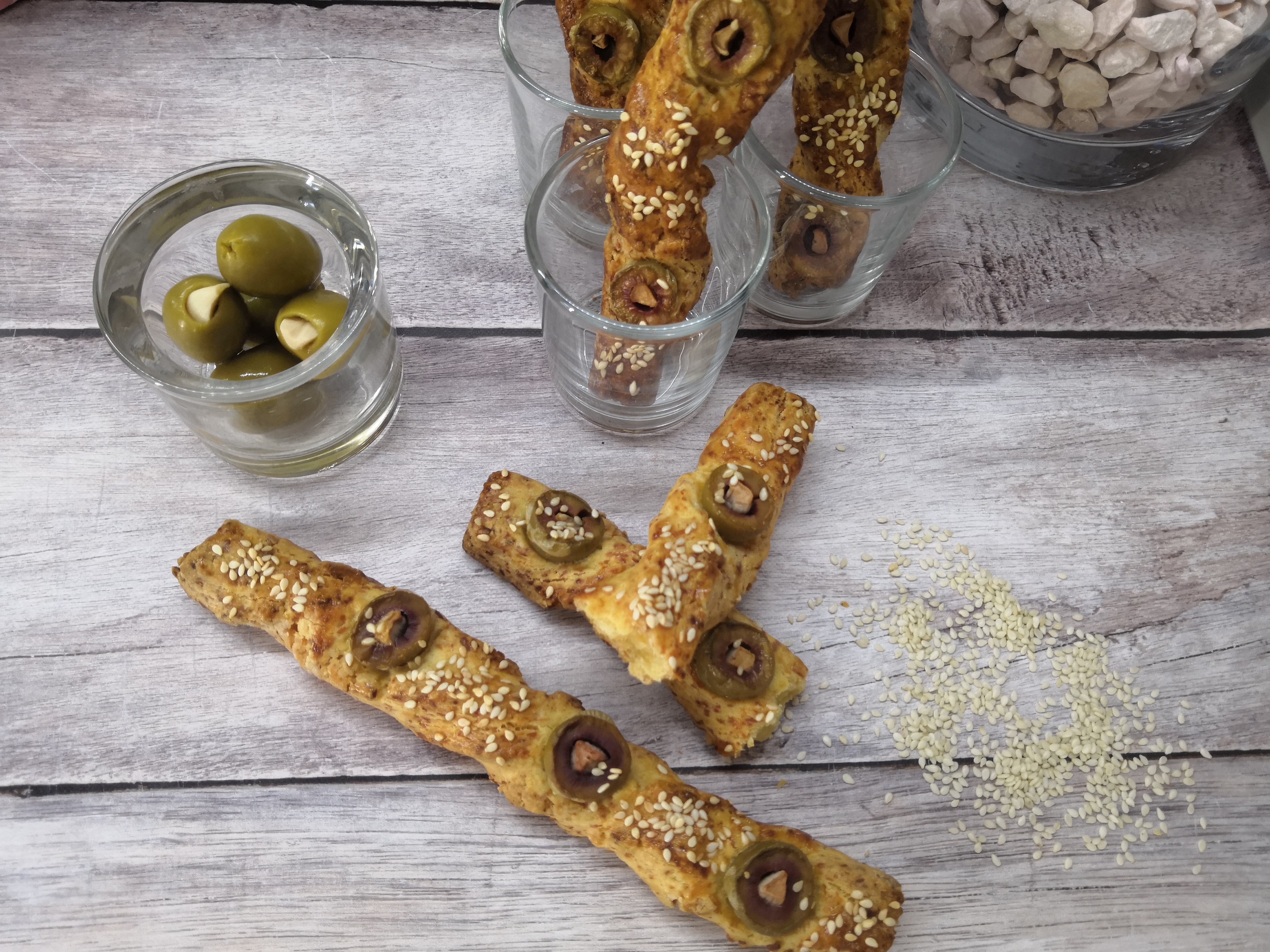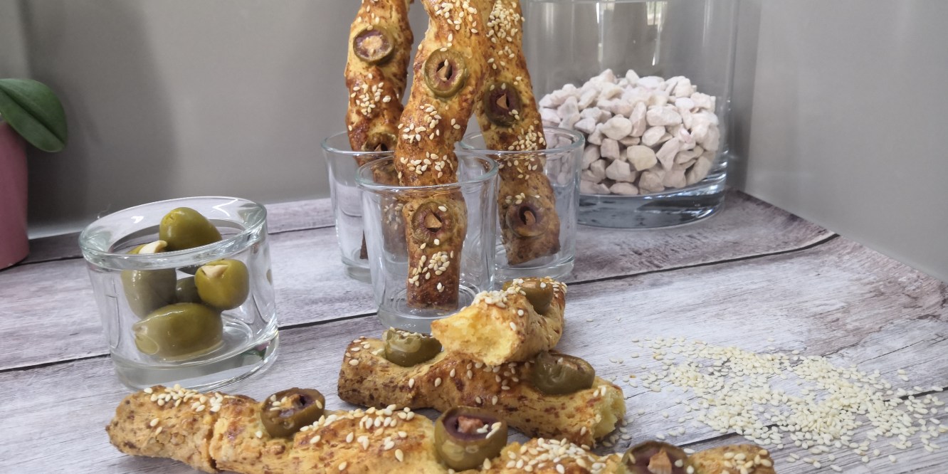 Nagyon egyszerű sajtos rudat feldobhatunk pár csavarással, szezámmaggal és némi fokhagymával töltött olíva bogyóval. Roppant gyors, egyszerű és mutatós.