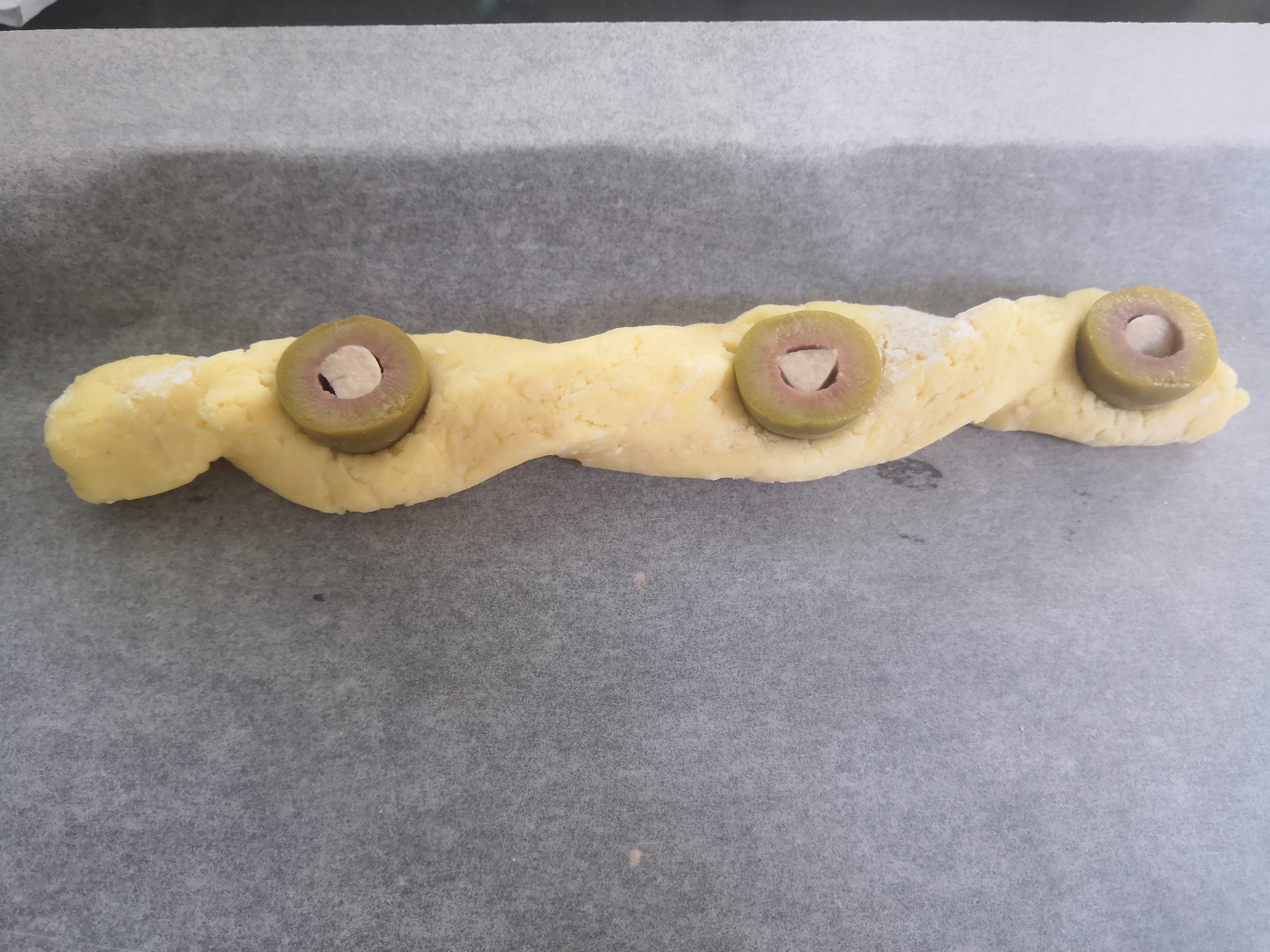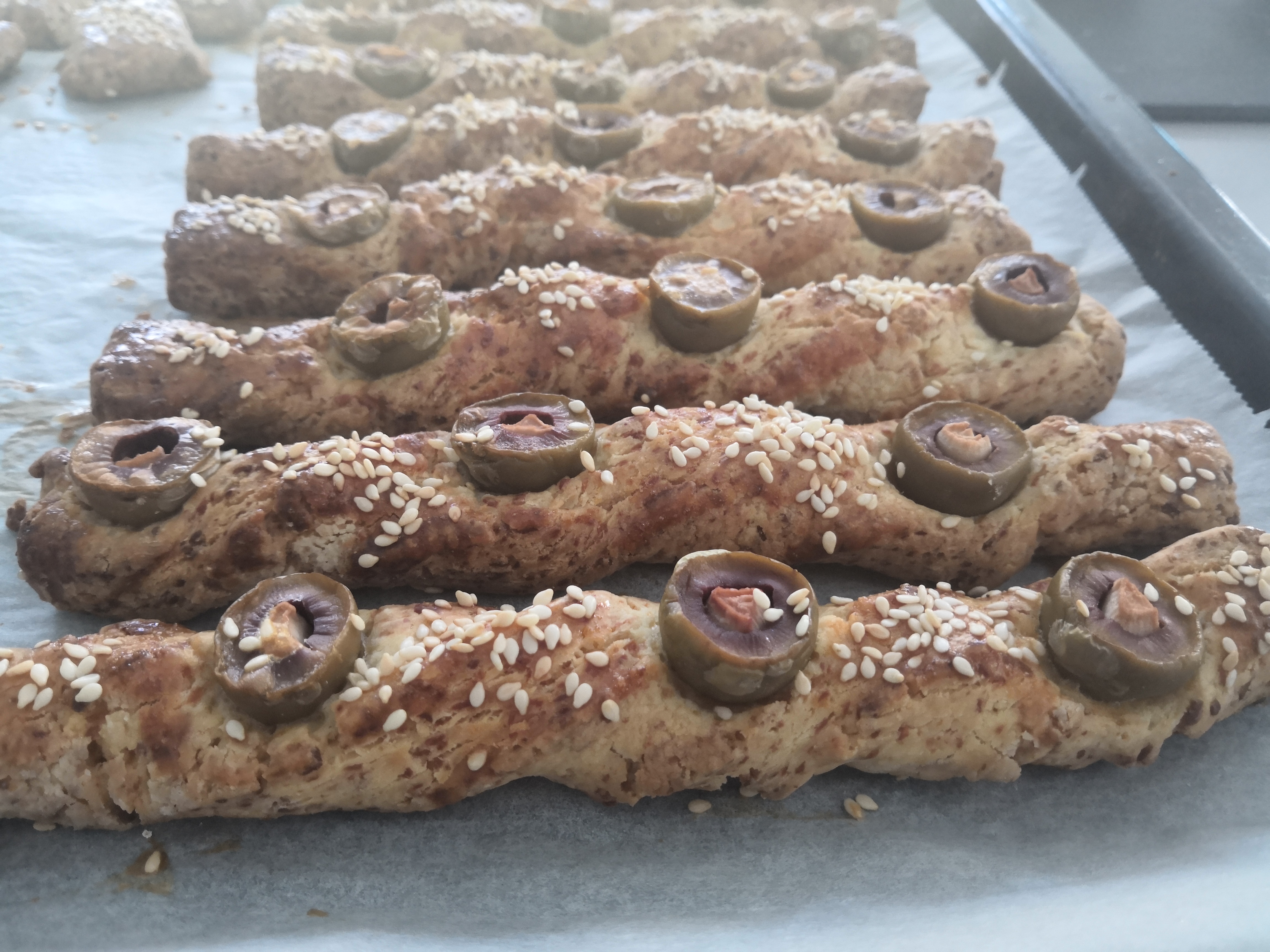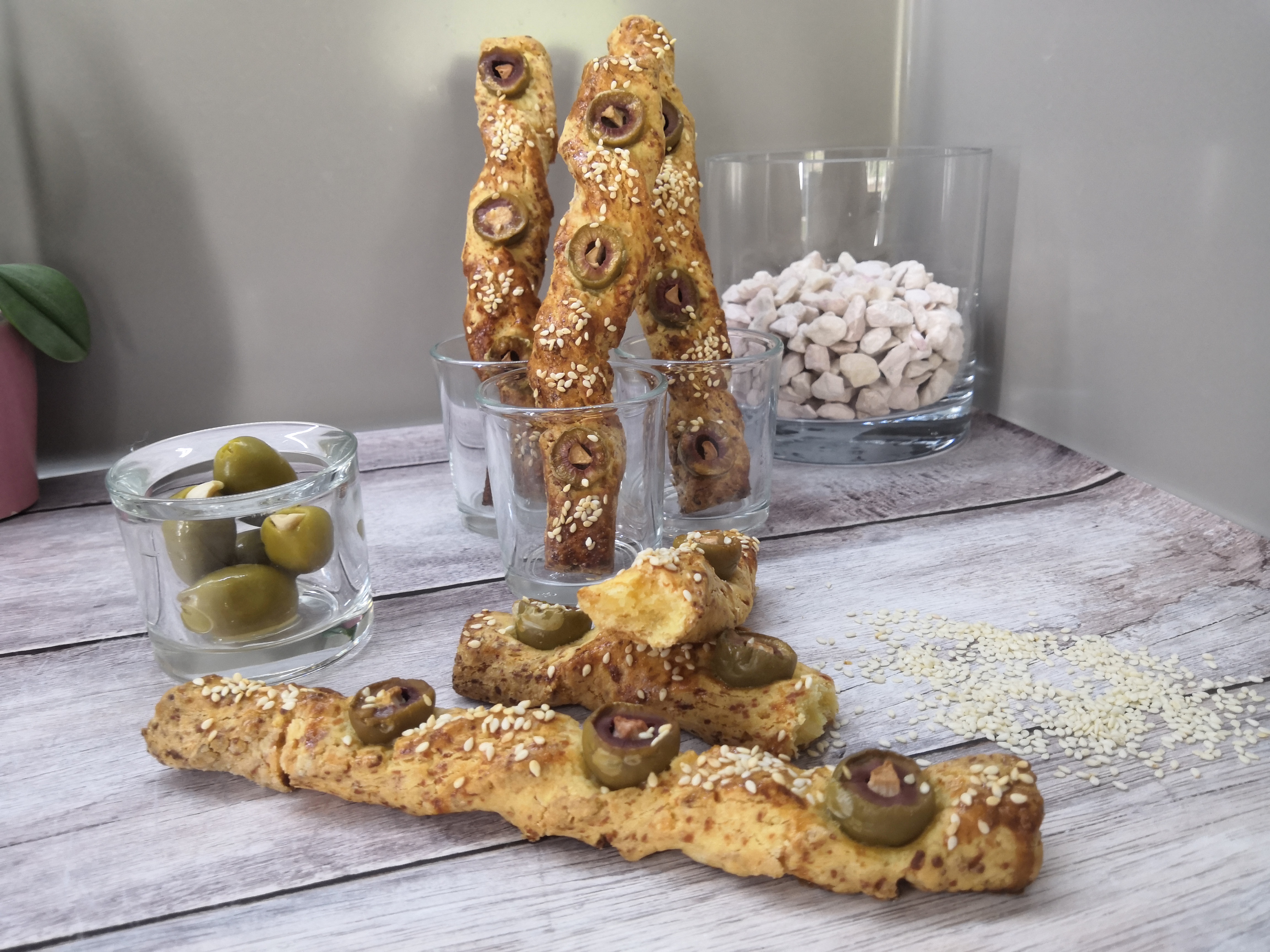 Nagyon egyszerű sajtos rudat feldobhatunk pár csavarással, szezámmaggal és némi fokhagymával töltött olíva bogyóval. Roppant gyors, egyszerű és mutatós.