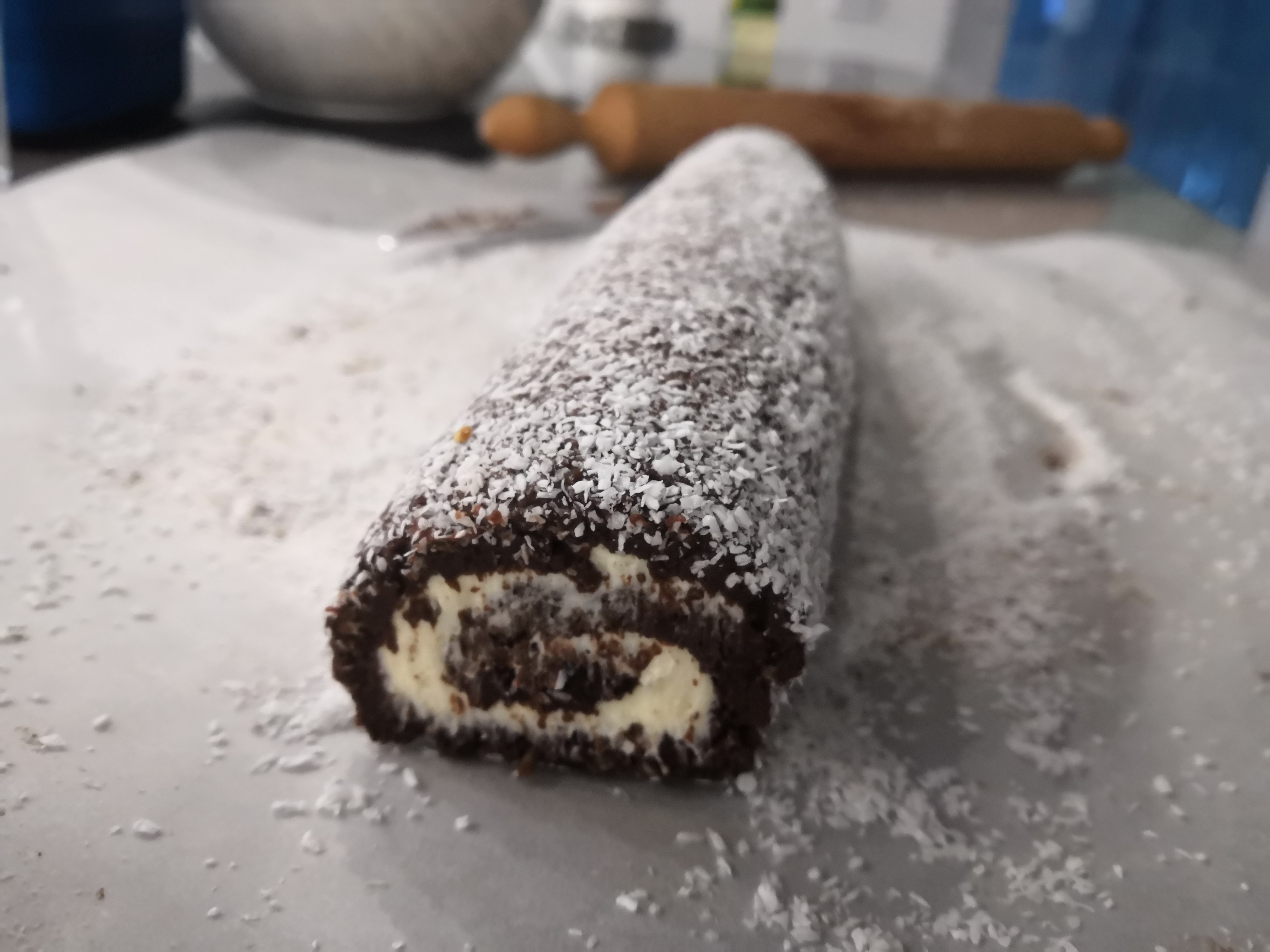 - A kakaós masszát kókusszal megszórt sütőpapíron nyújtsuk ki (azért sütőpapíron, mert így könnyebb tekerni