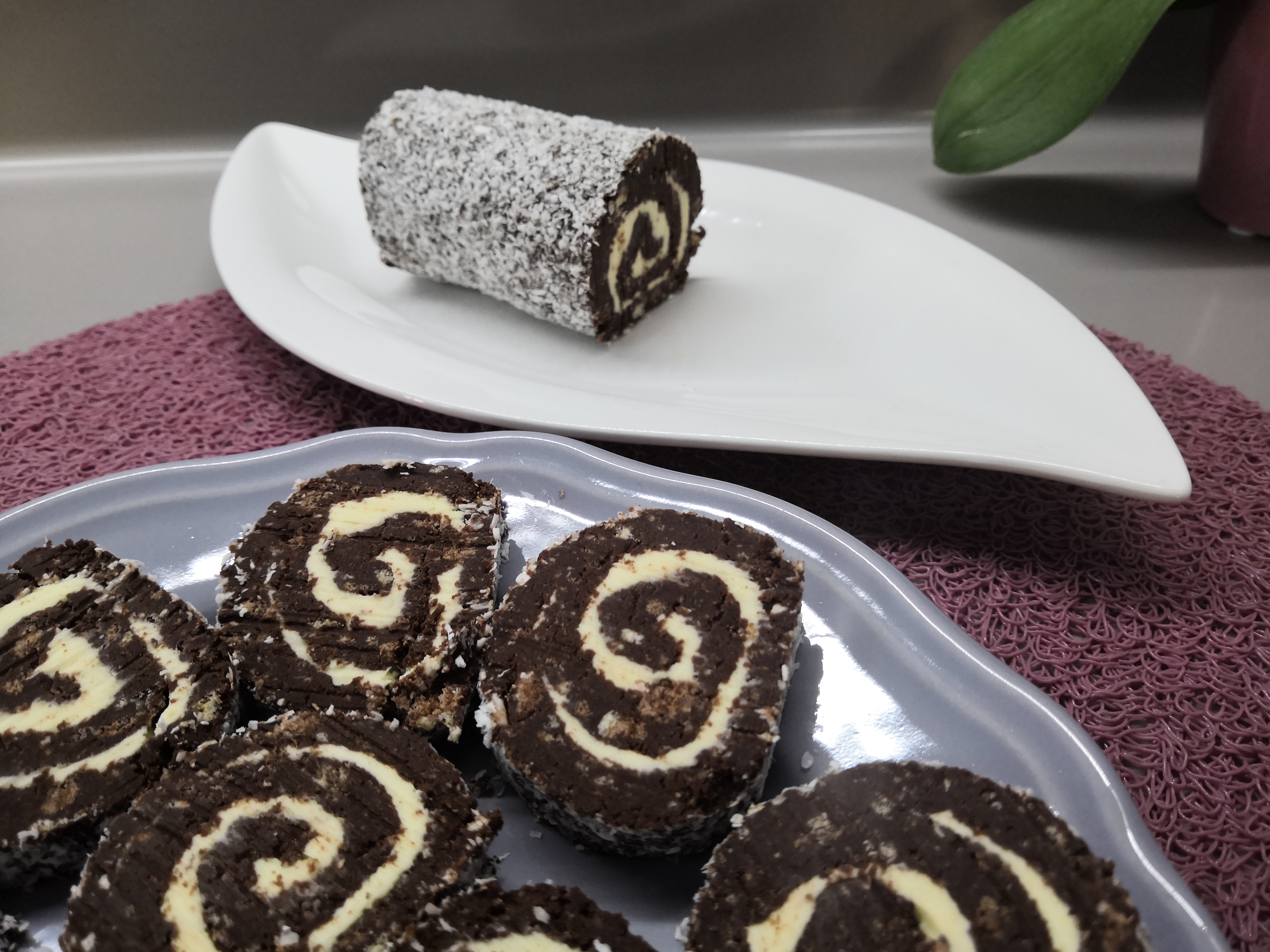 A totyogóm éppen rendet rakott a kamrában, mikor hatalmas kincsre lelt: megtalálta az eldugott kekszes dobozt. Boldogan rohangált vele a lakásban és harapott bele az ezer ízű kekszek némelyikébe. Felbecsülhetetlen értékek és karácsonyi mézeskalács maradványok lapultak a doboz legmélyén. Akadt némi makacs, alakváltó keksz, csiga keksz és ragasztás előtt elfeledett linzer a kincsek között. A kamasszal arra az elhatározásra jutottunk, hogy még mindegyik ehető, ki nehogymár dobjuk, dolgozzuk fel. Így született meg ez a fantasztikus, retro kókusztekercs.