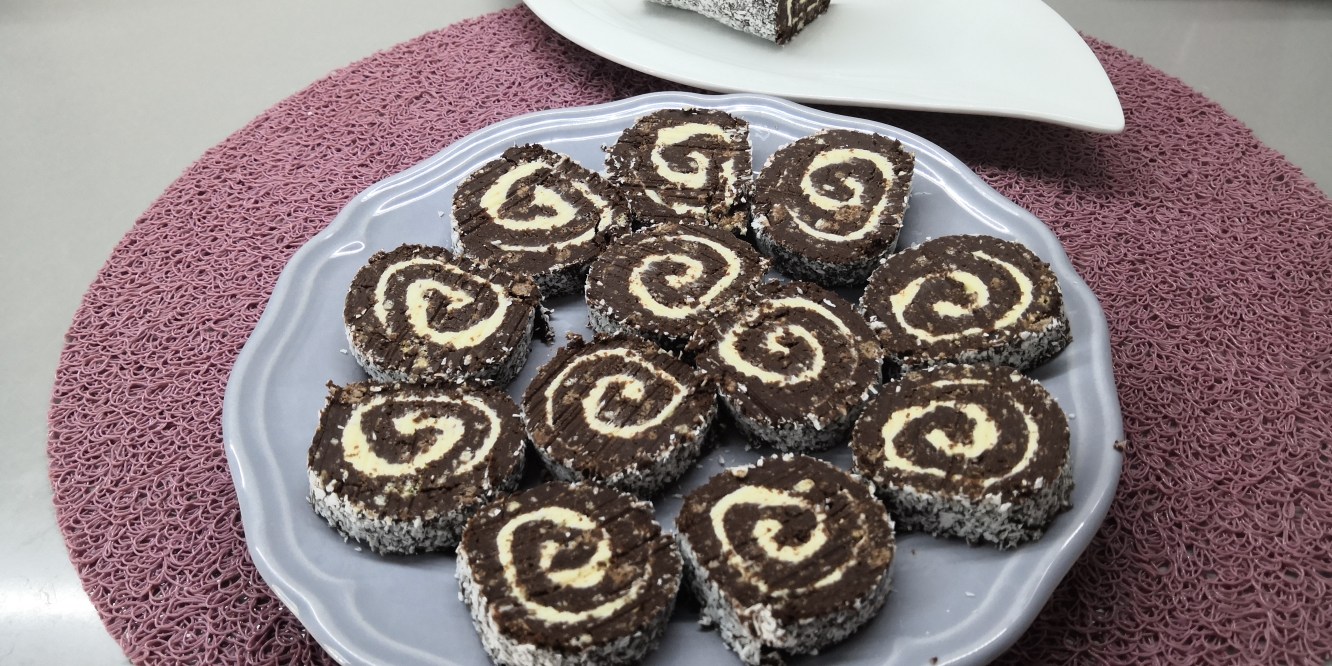 - A kakaós masszát kókusszal megszórt sütőpapíron nyújtsuk ki (azért sütőpapíron, mert így könnyebb tekerni