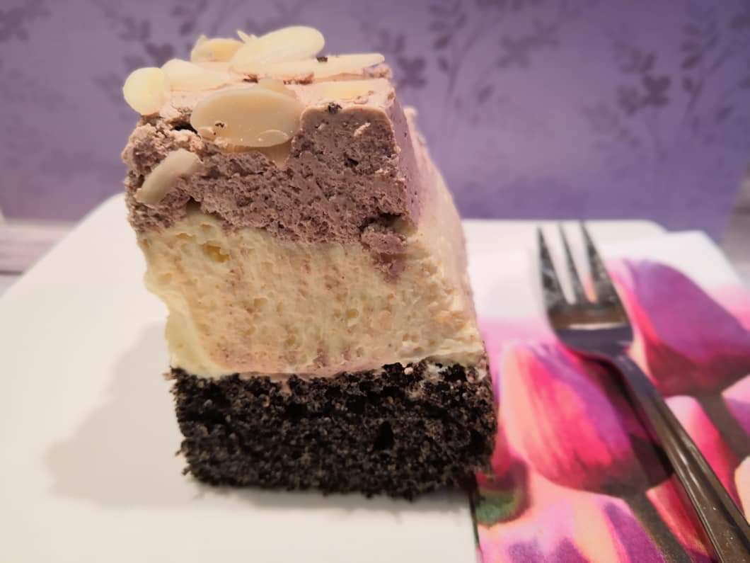 Sajnos nem volt ideje a rétegeknek összeérni, a krémnek teljesen lehűlni, a szeletelés várakozáson aluli, de az íze feledteti a külsérelmi nyomokat.”