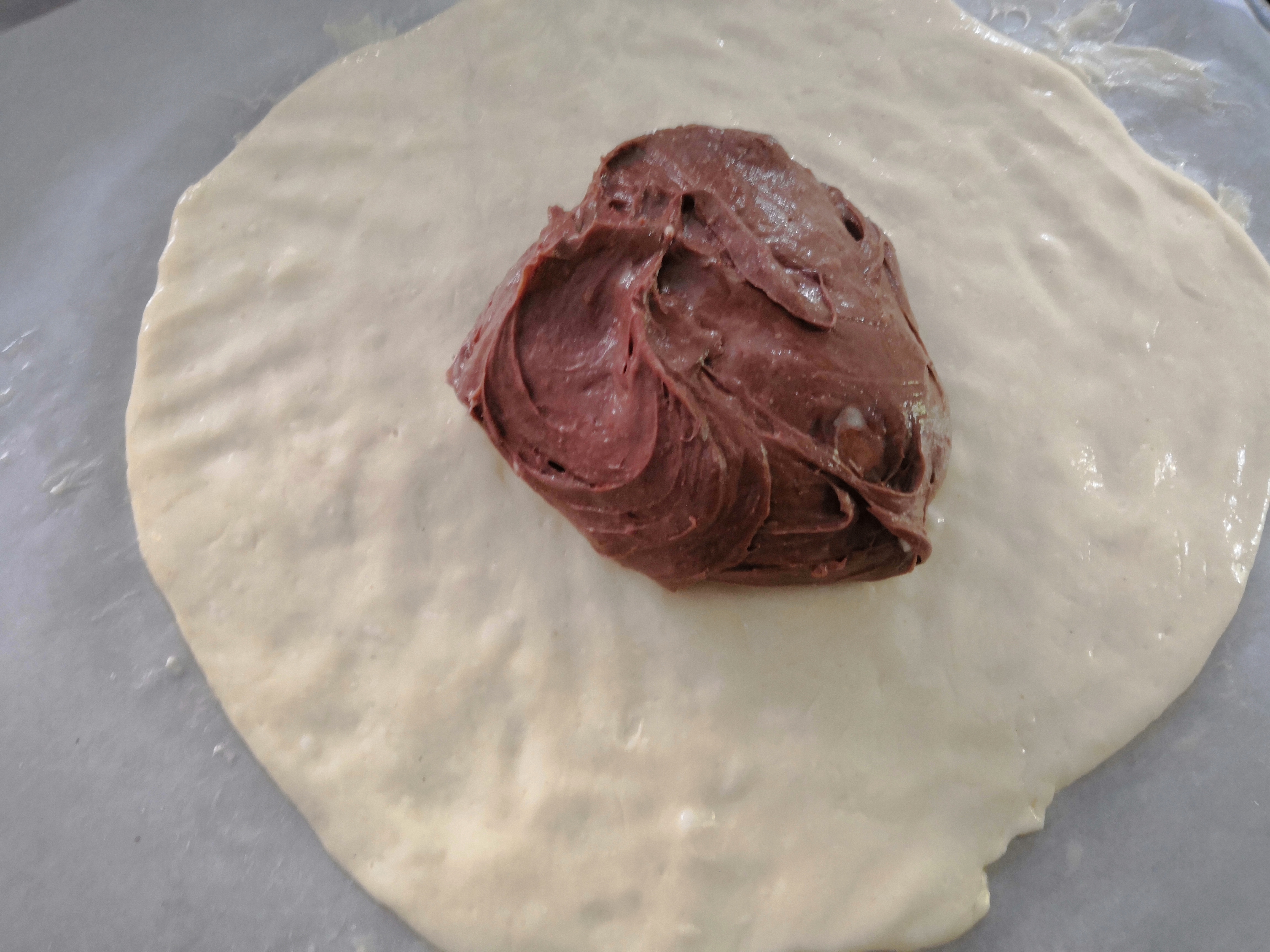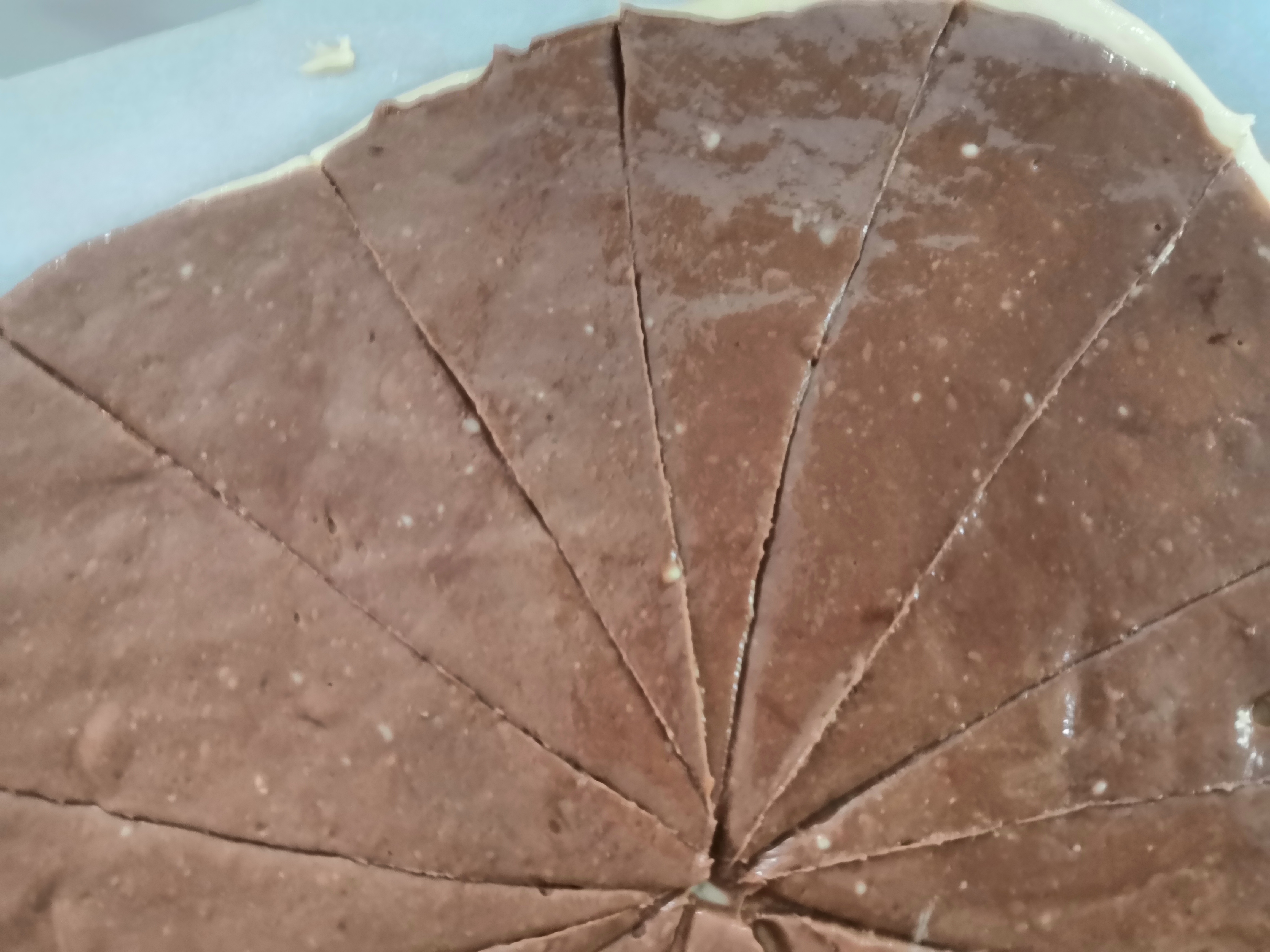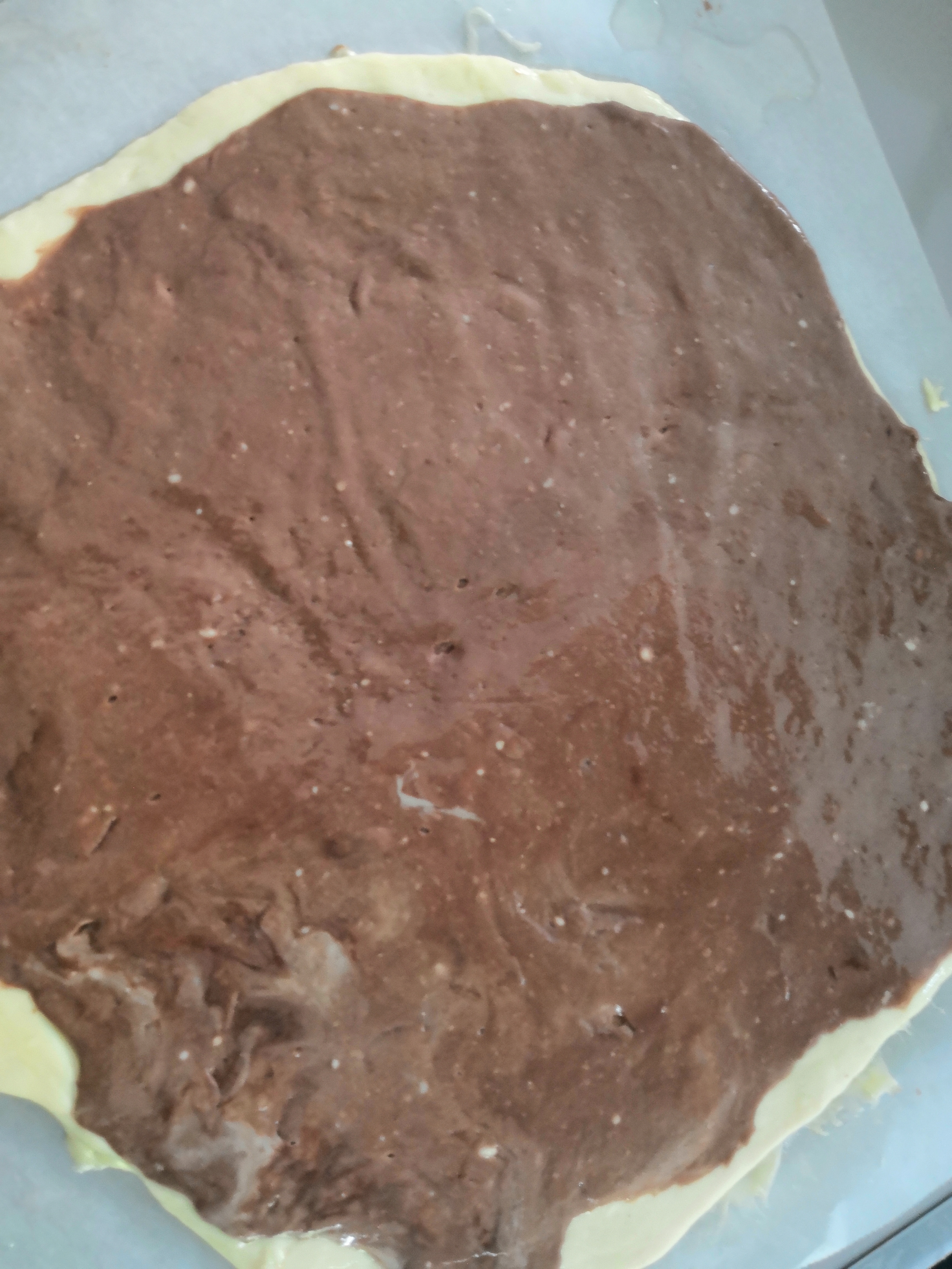 - Nyújtsunk a fehér tésztából egy kört. Kb 2-3 mm vastagra.