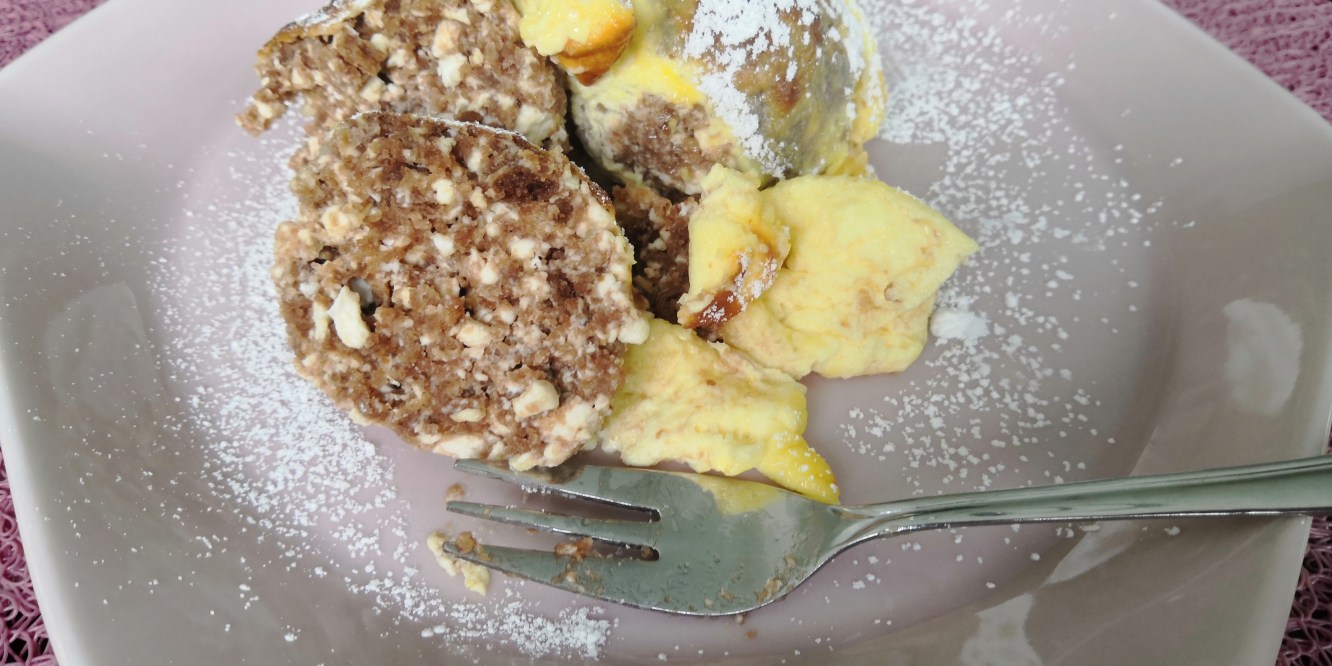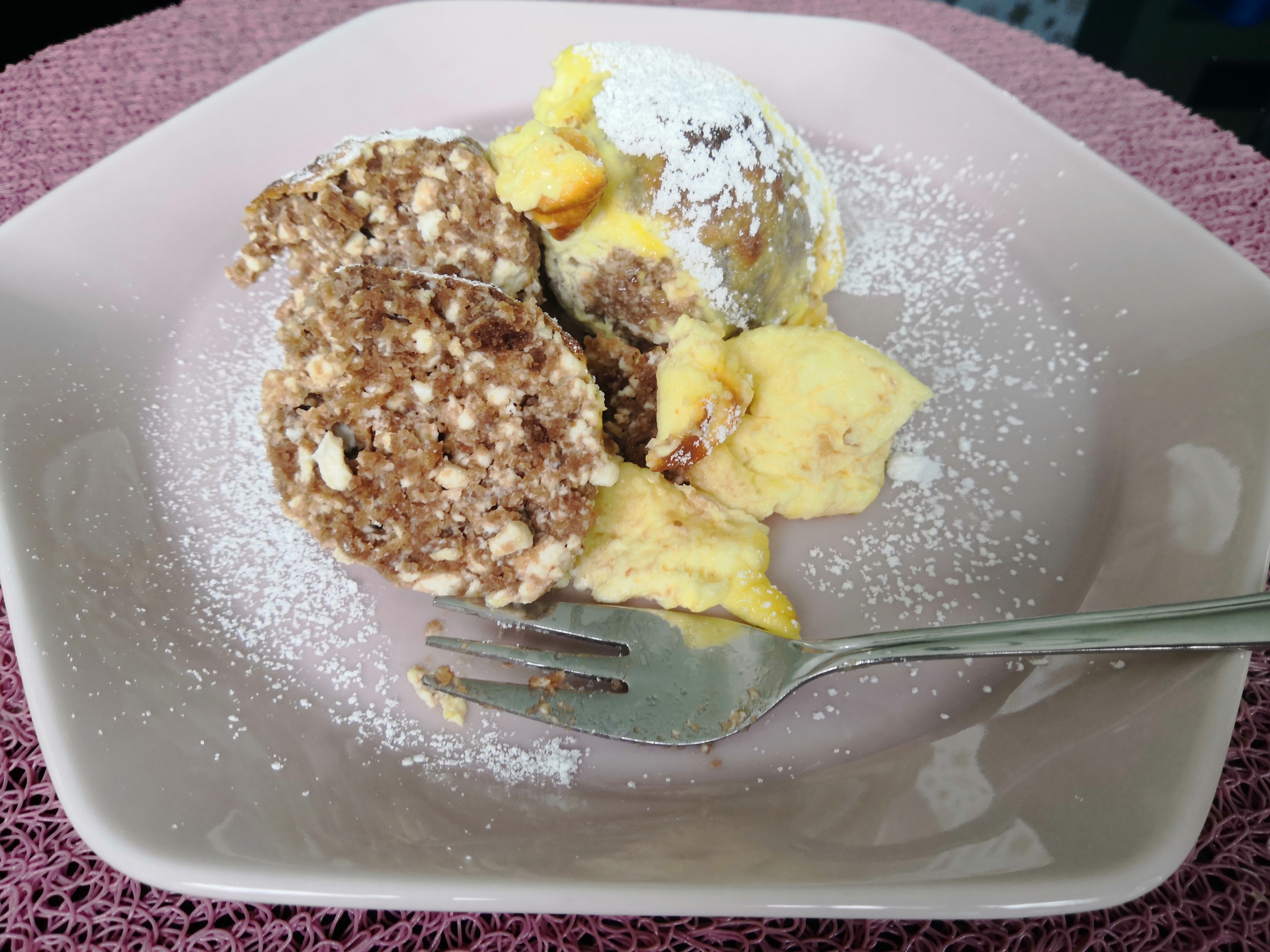 Elég sok kakaós kalács maradt húsvétról, mivel kissé megszáradt, de kidobni sajnáltam, ezért túrógombócot készítettem belőle sütőben sütve.