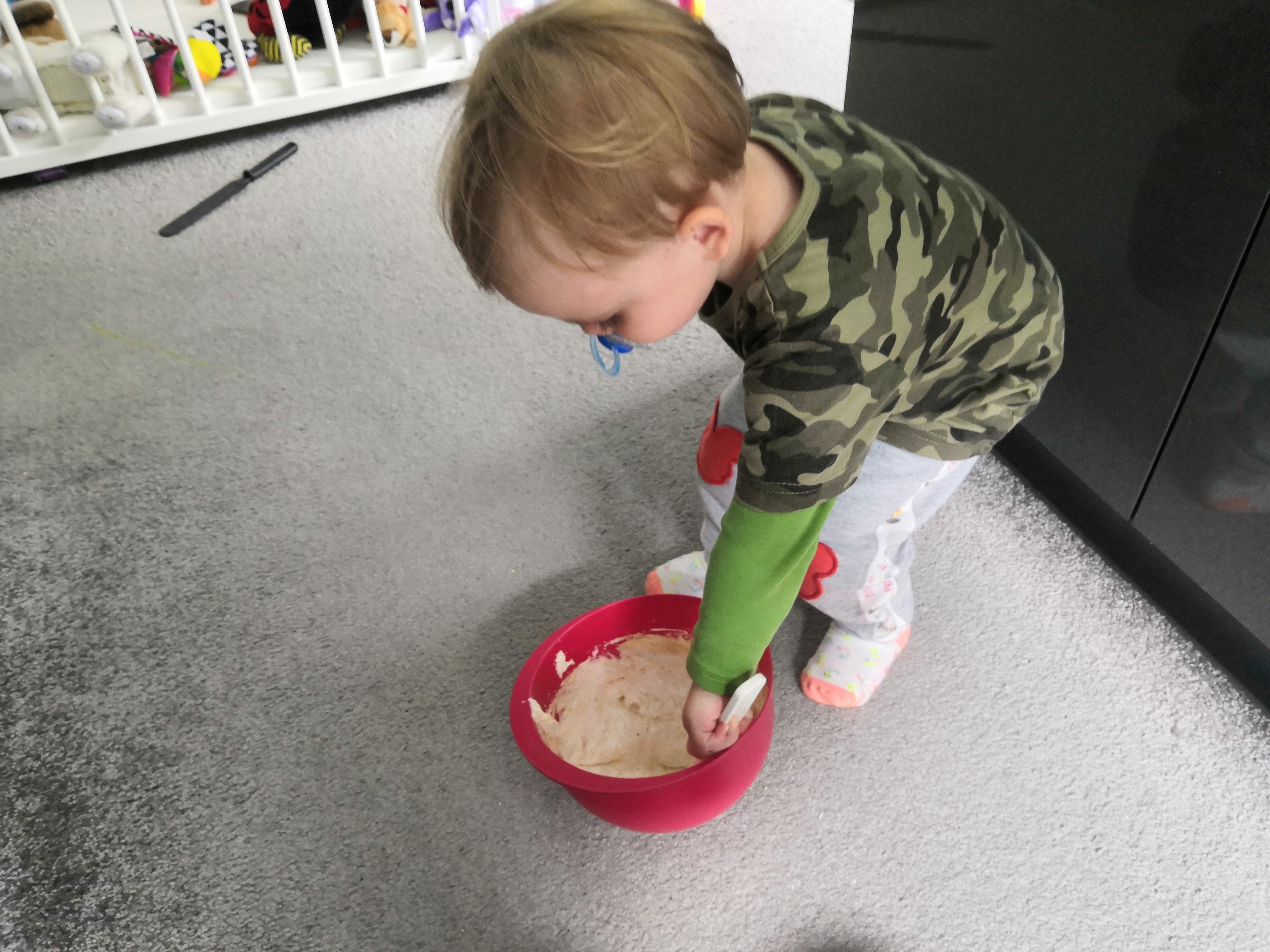 A türelemmel vannak még időnként problémák, vagy egész egyszerűen a matematikát kell többet gyakorolnunk. Hiába mondtam, hogy két, kerek lapot kenünk és 2x várunk, hogy megsüljön, hajthatatlannak bizonyult, ezért egy téglalap lett és csak 1x vártunk, hogy megsüljön.