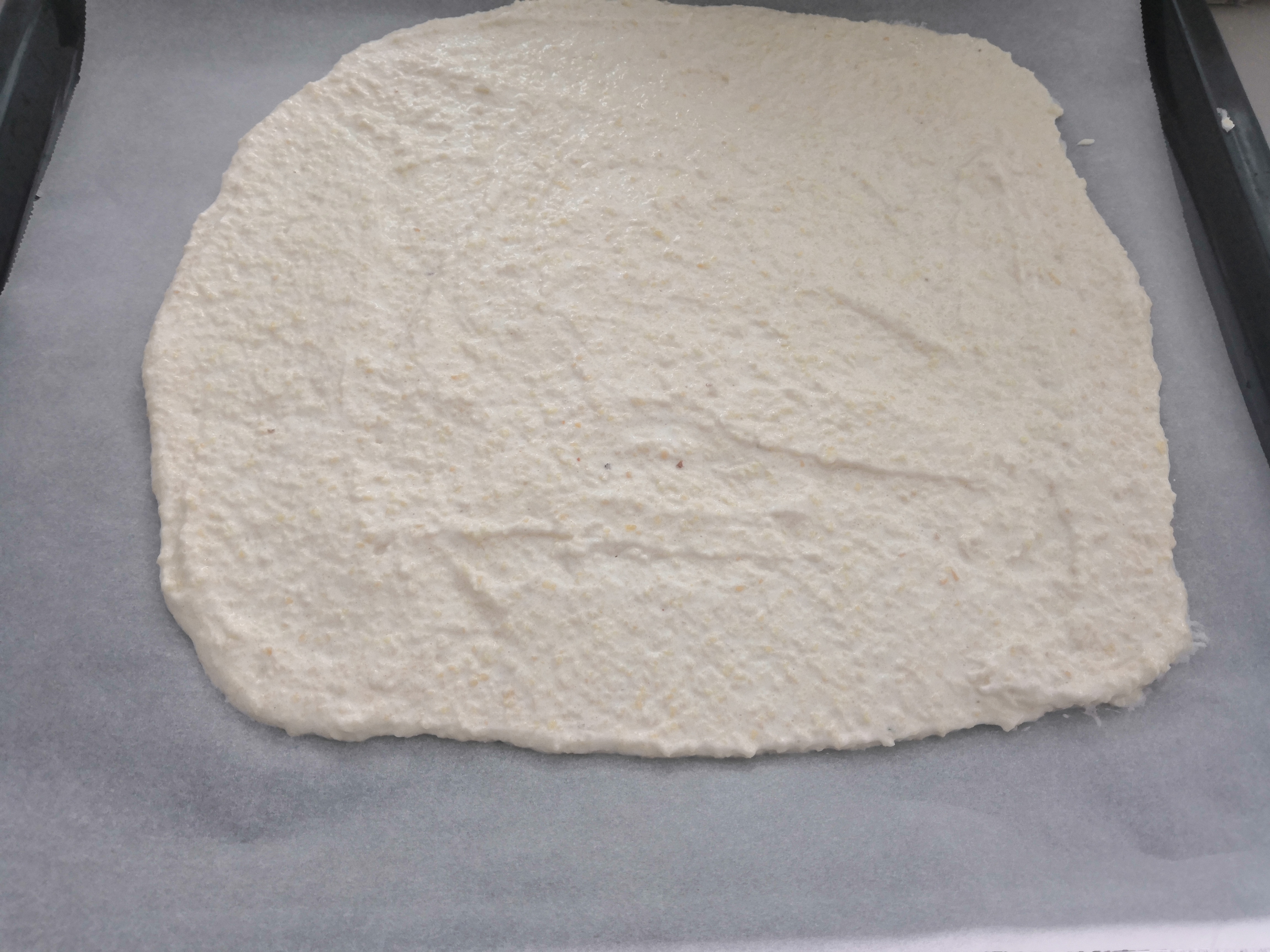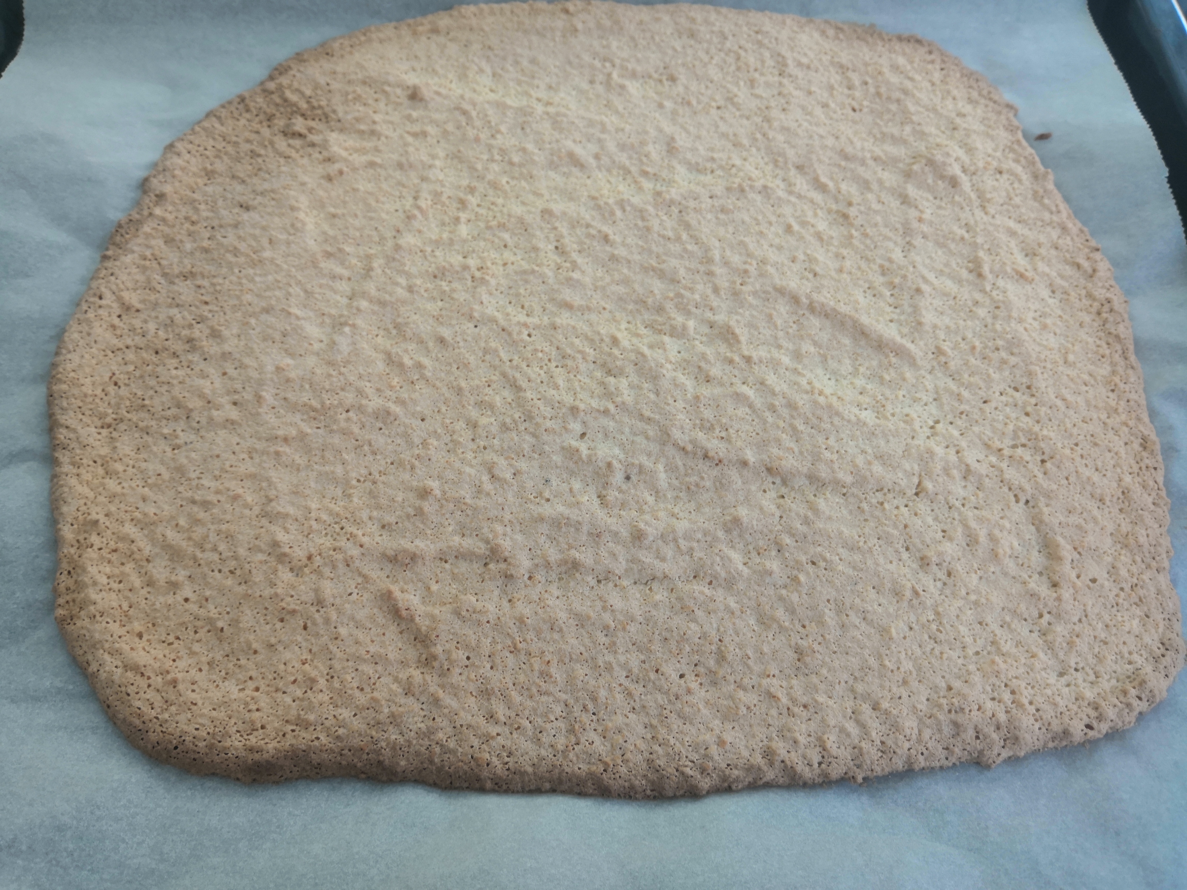 - Kenjük sütőpapírral bélelt tepsibe a masszát, kb 50 mm vastag téglalapot (torta esetén 2 db kört)