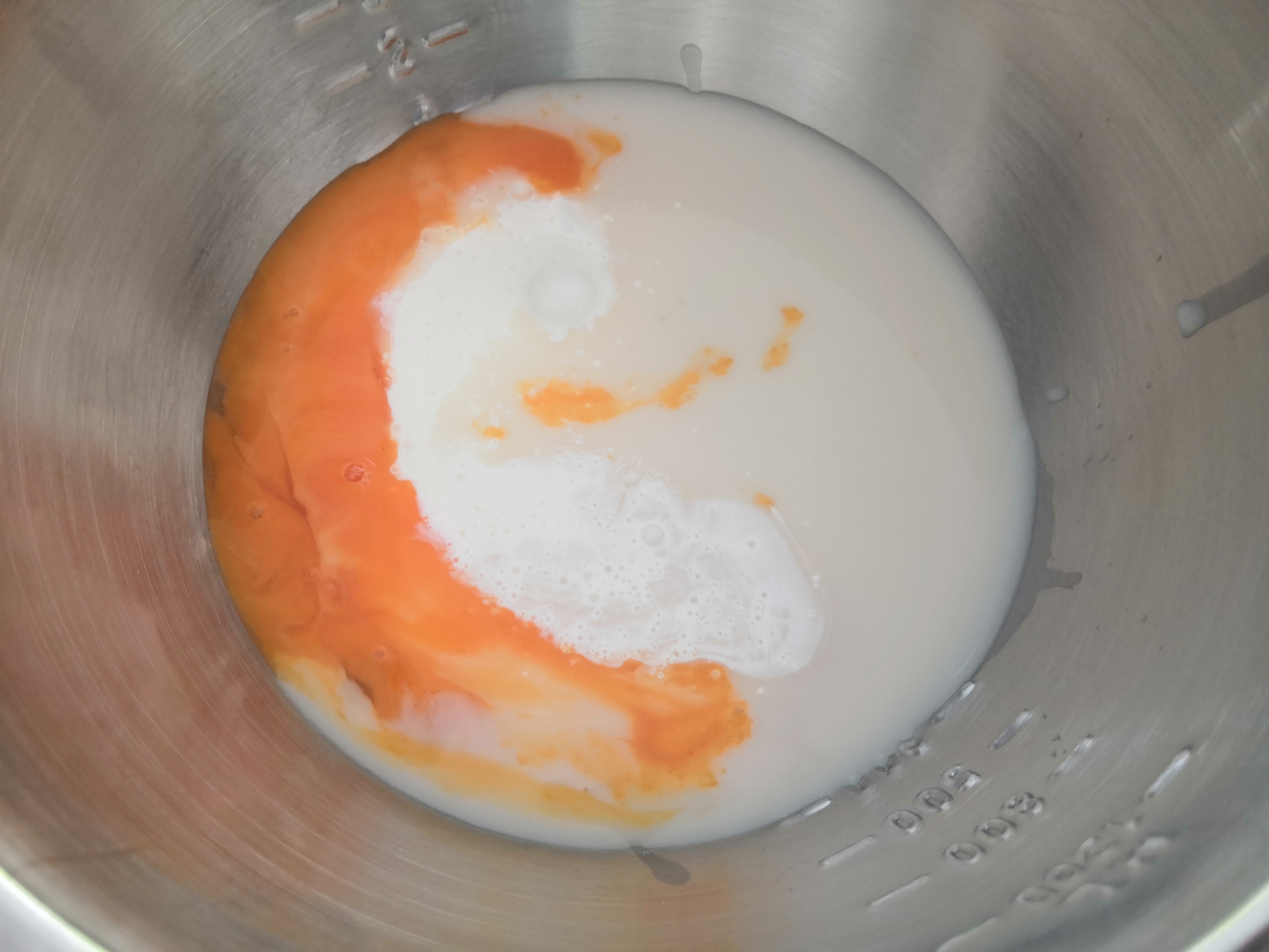 - A krémhez keverjük össze kézi habverővel a tojássárgáját, a cukrot, a tejet és a tejszínt.