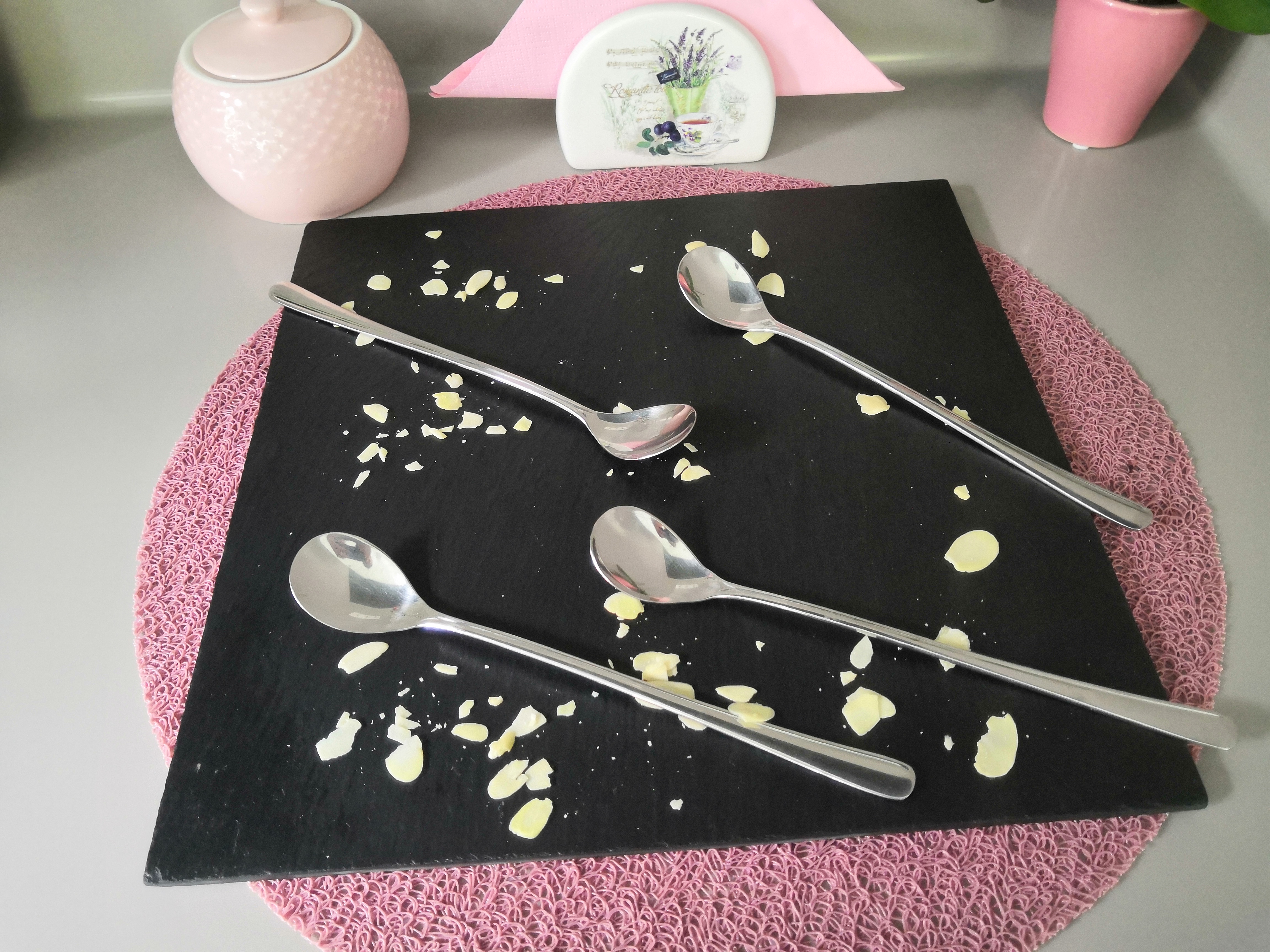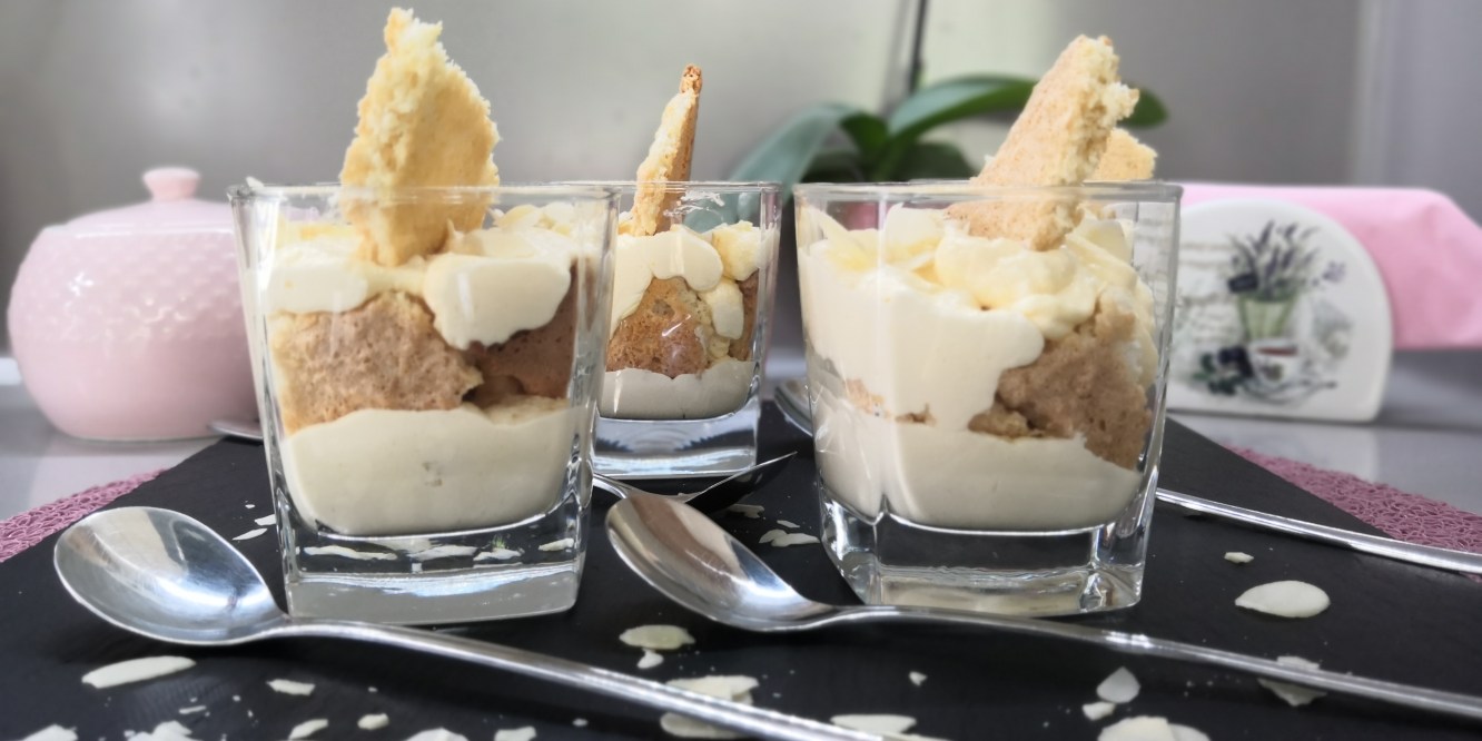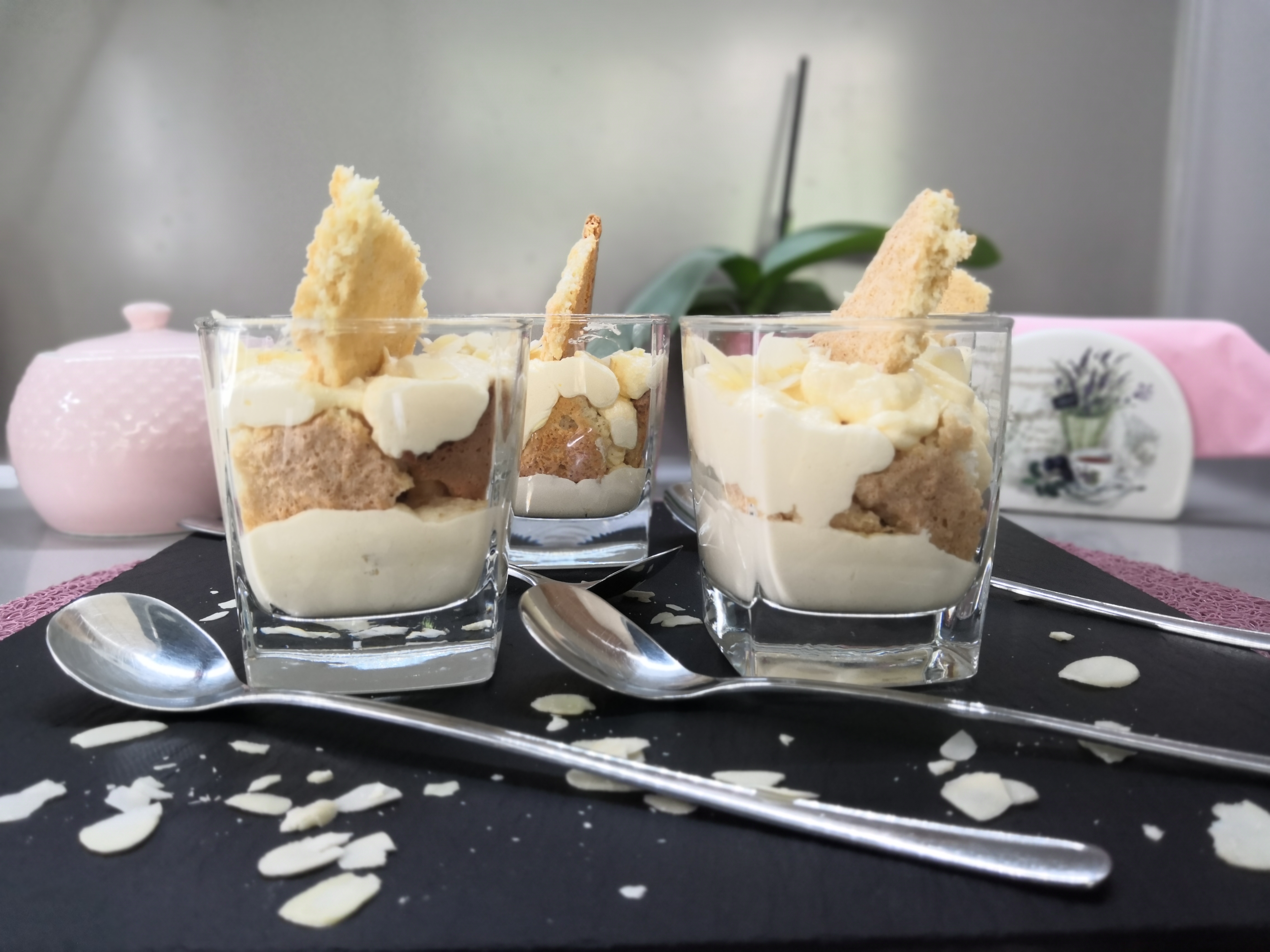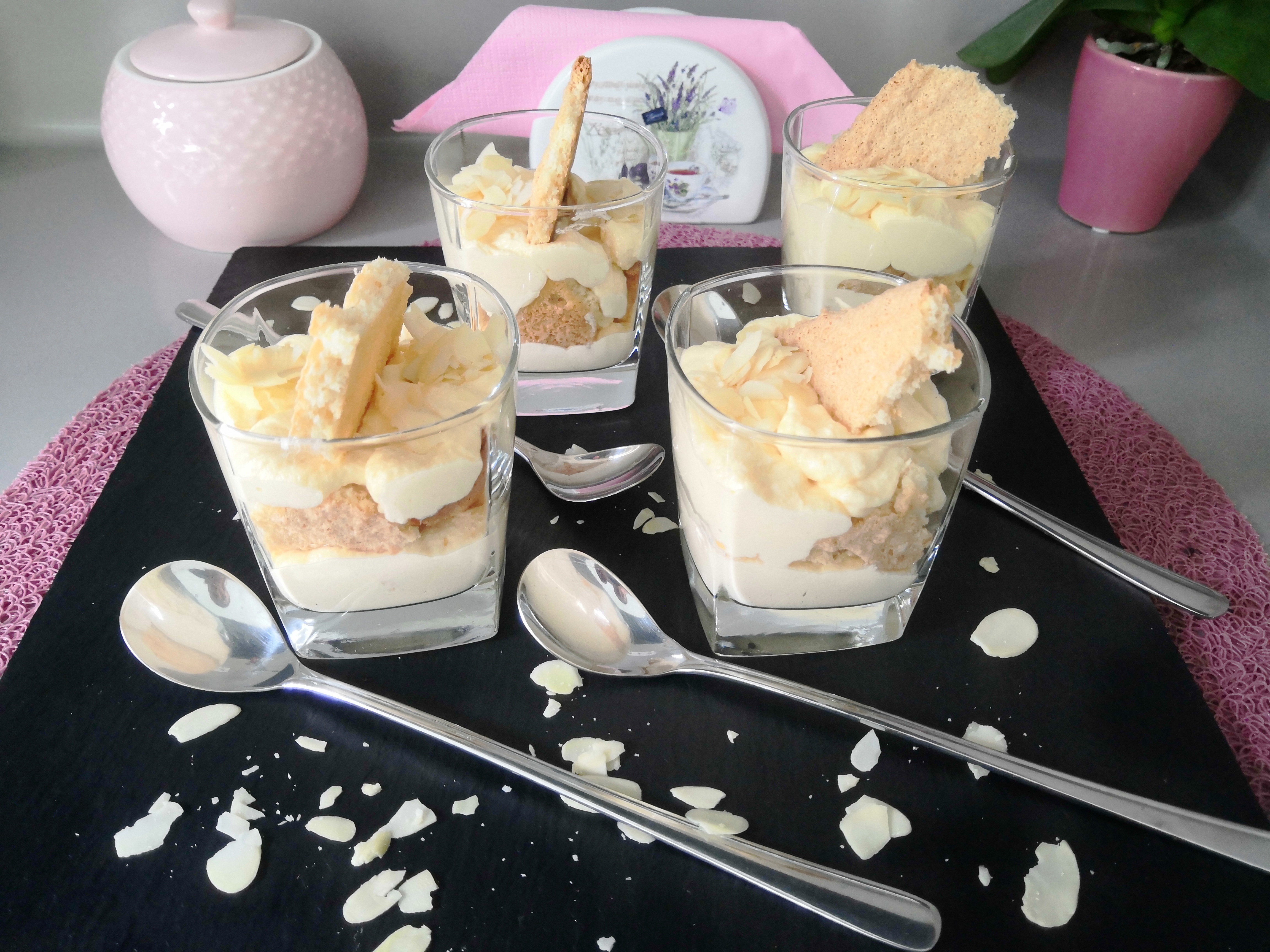 - Pohár aljába nyomjunk krémet, tegyünk rá mandulás lapot, újabb adag krémet. A tetejét szórjuk meg szeletelt mandulával