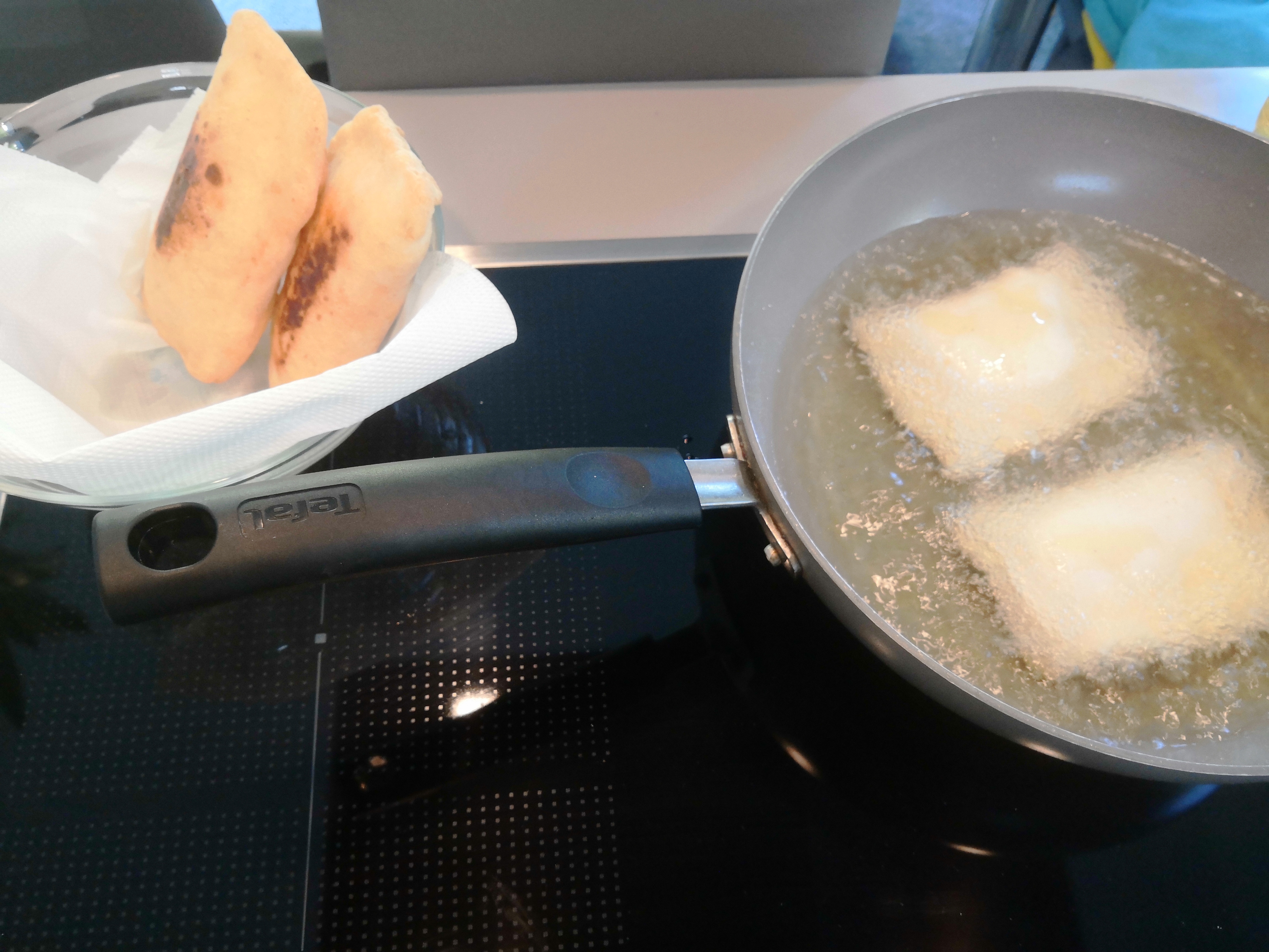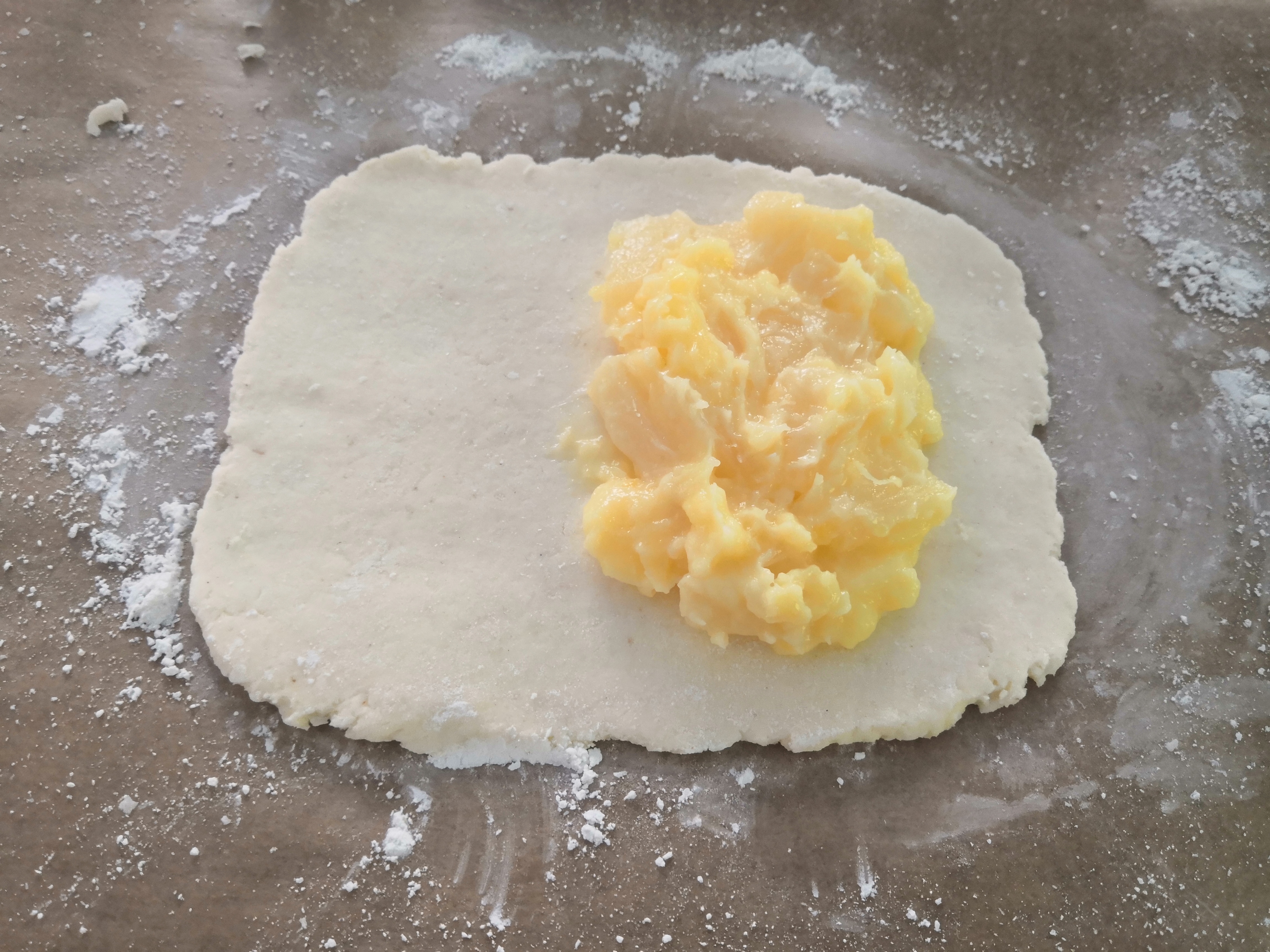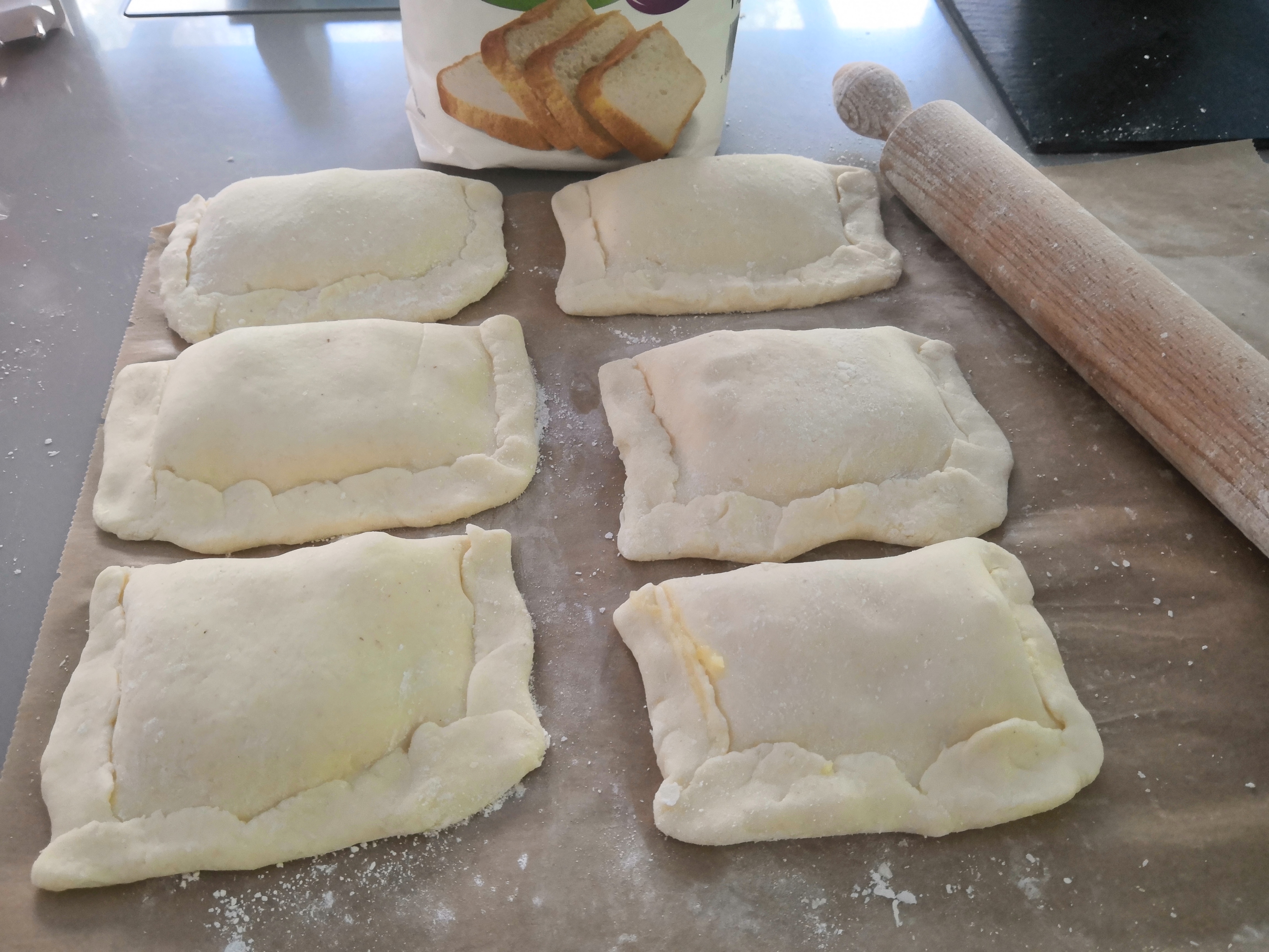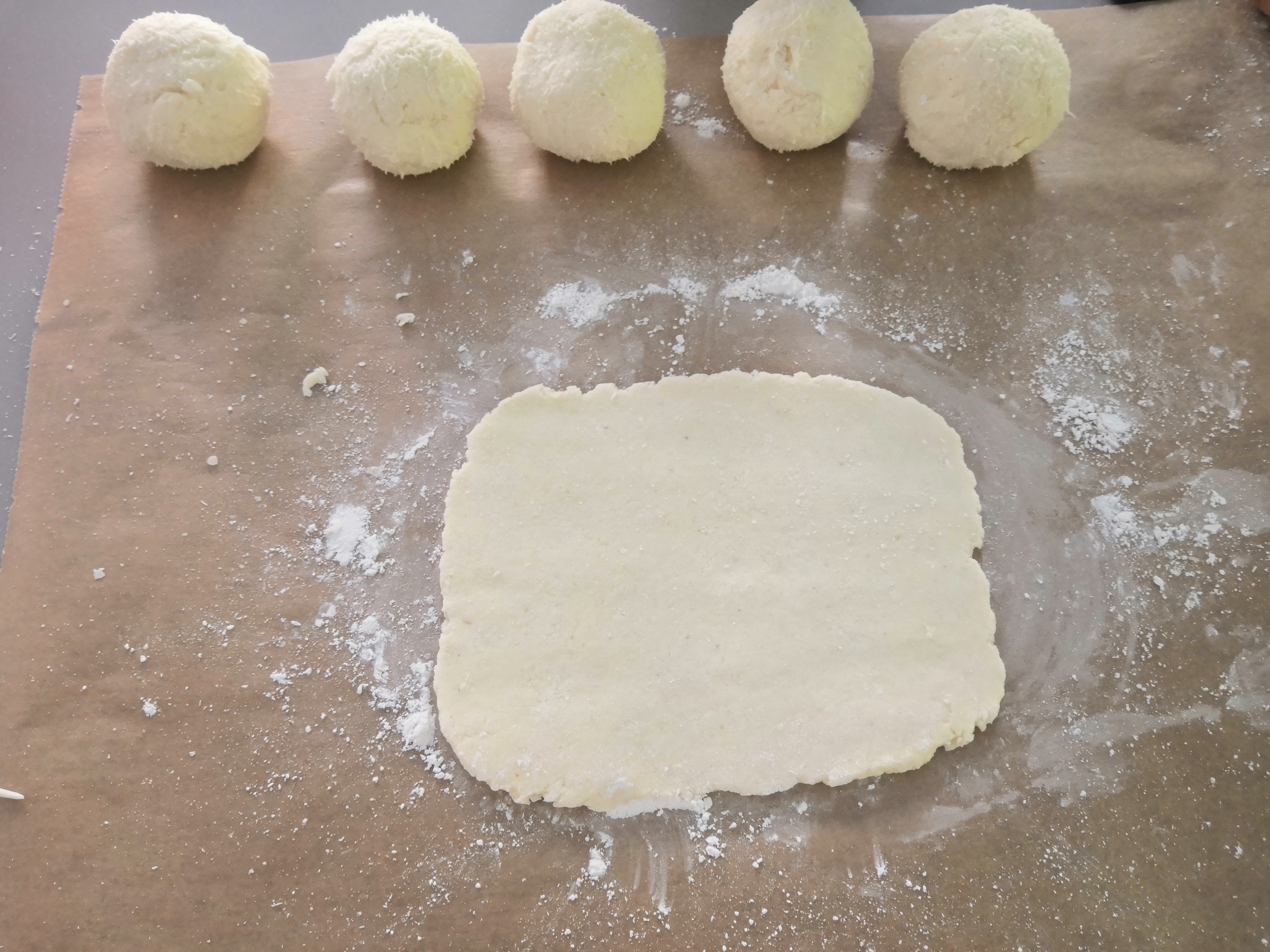 - A tésztát 6 egyenlő bucira osztjuk és vékony téglalapot nyújtunk belőle