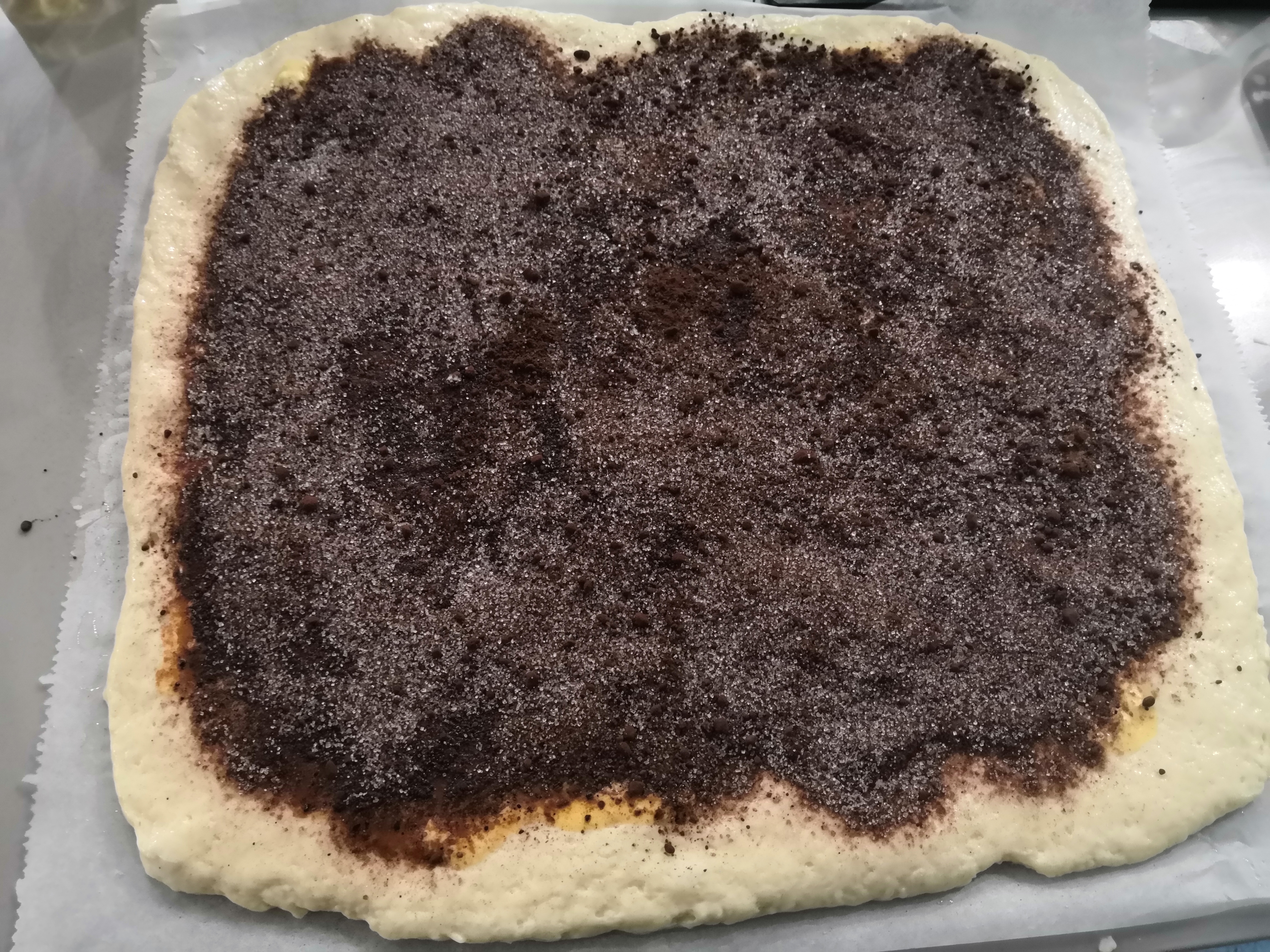 - A tészta tetejét megkenjük olvasztott margarinnal, a cukrot és a kakaót összekeverjük és a margarin tetejére szórjuk.