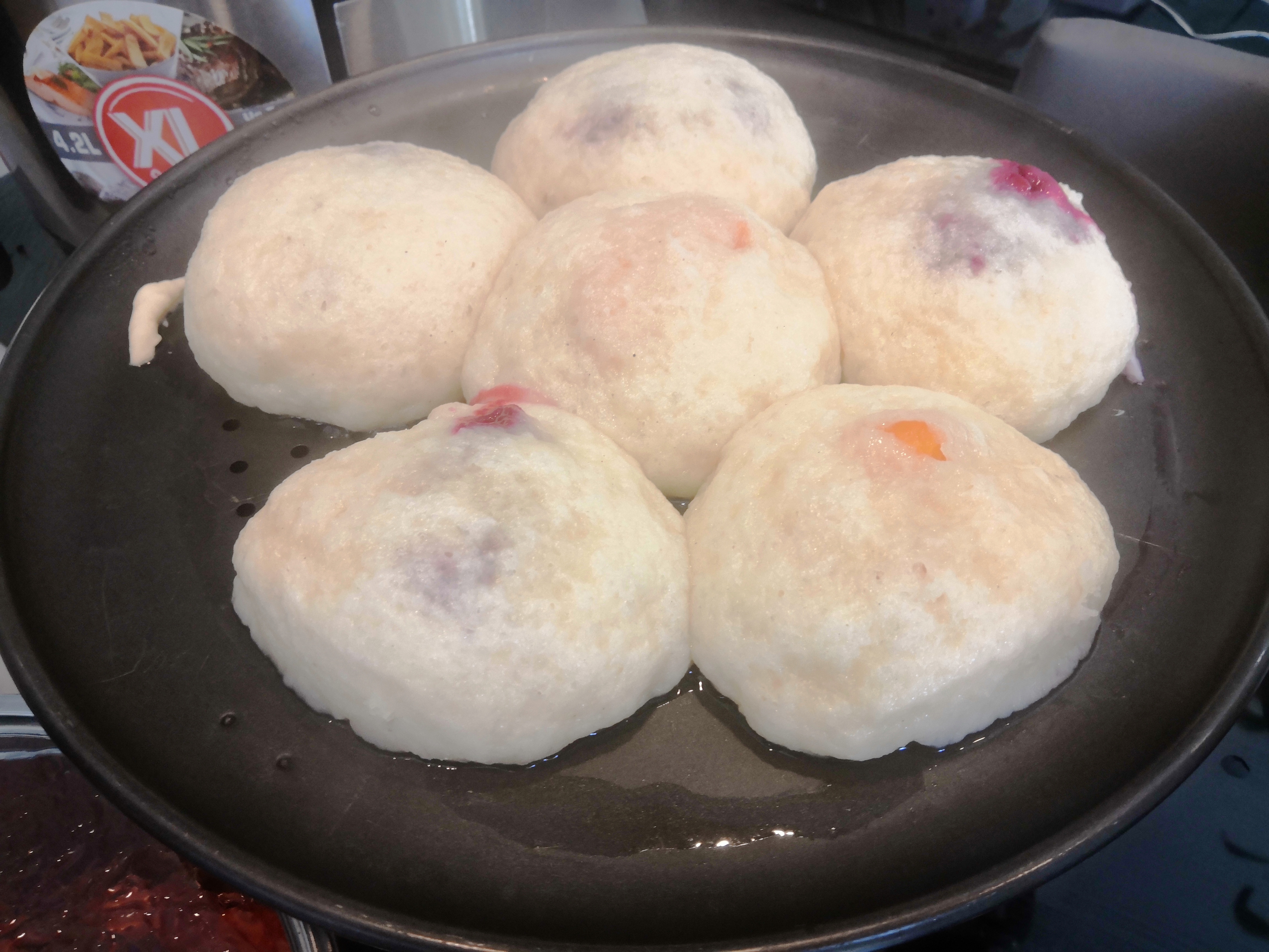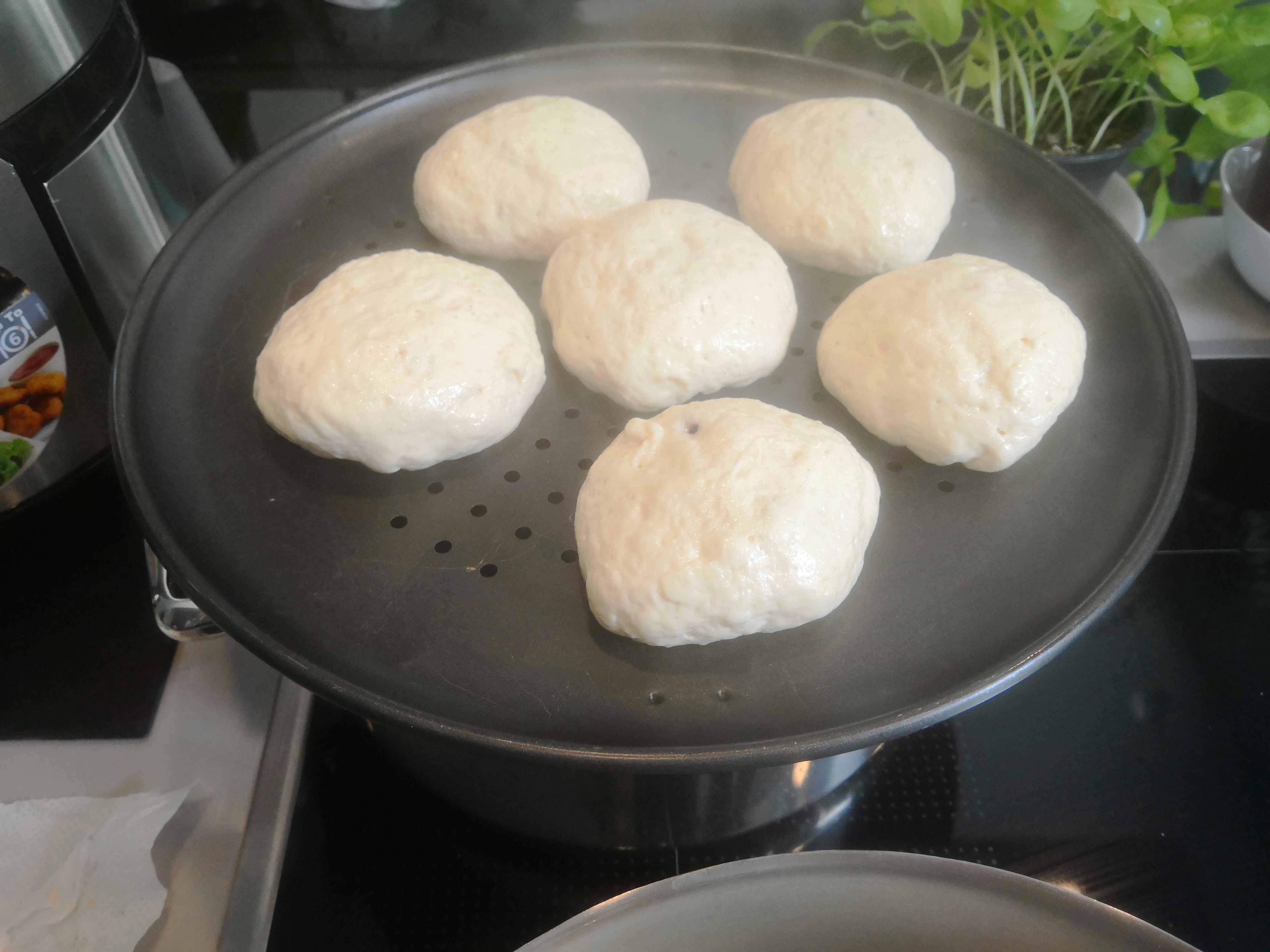 Mivel nincs semmiféle knédli főző szerkezetem, ezért 2 nagy lábost és egy lyukacsos aljú pizza sütőt használtam a gőzöléshez. Az egyik lábosba vizet tettem, a pizza sütőre raktam a gombócokat. Amikor felforrt a víz, a lábos tetejére tettem a pizza sütőt és lefedtem a másik lábossal. Pontosan 15 percet gőzöltem a gombócokat.