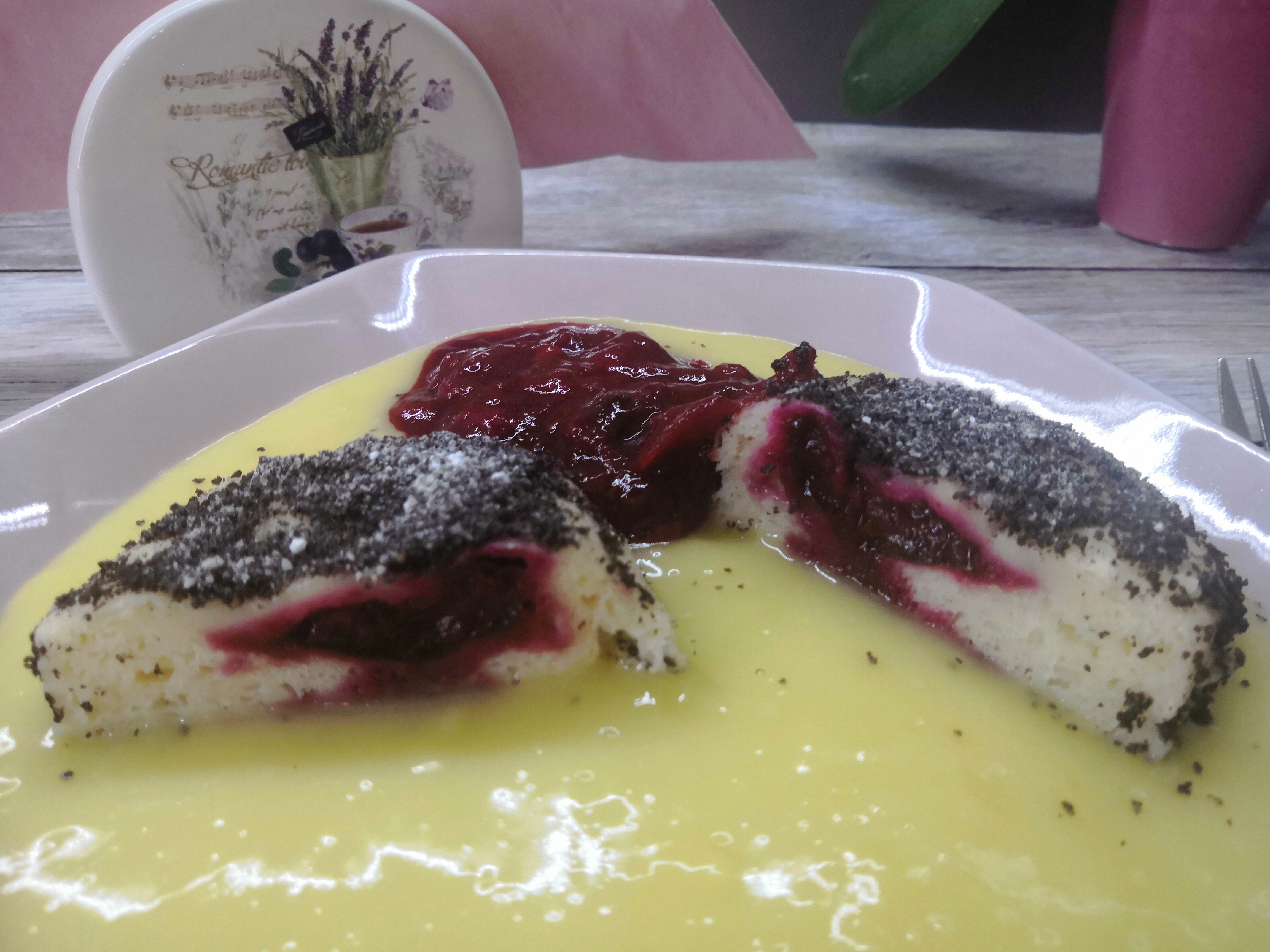 A férjem mivel mák rajongó, a felét cukros mákba forgattam, én annyira nem szeretem, ha mákos a fogam, ezért a másik fele mandula bundát kapott. Maradt pár darab sárgabarack és szilva, ebből szószt készítettem hozzá. A gyümölcsöket egy lábosban pár percig rotyogtattam, majd cukorral ízesítettem. Ez fantasztikusan egészítette ki a vaníliás sodóval együtt a gombócokat. A sodót most Haas vaníliás sodó porral készítettem. Egy csomag porhoz 400 ml kókusztejet és 2 evőkanál cukrot kevertem. A recept 3 evőkanál cukrot ír, de nekem úgy nagyon édes.