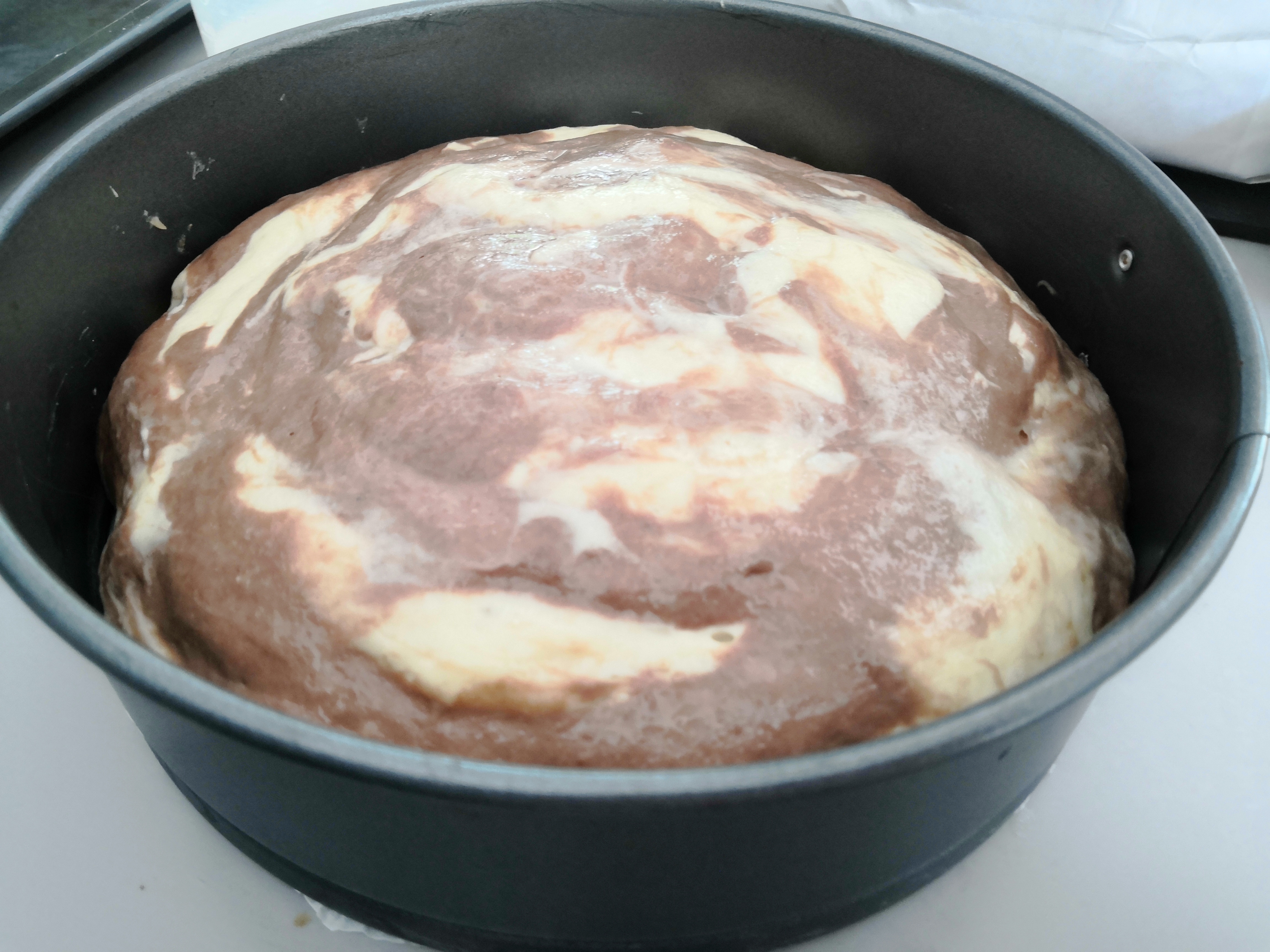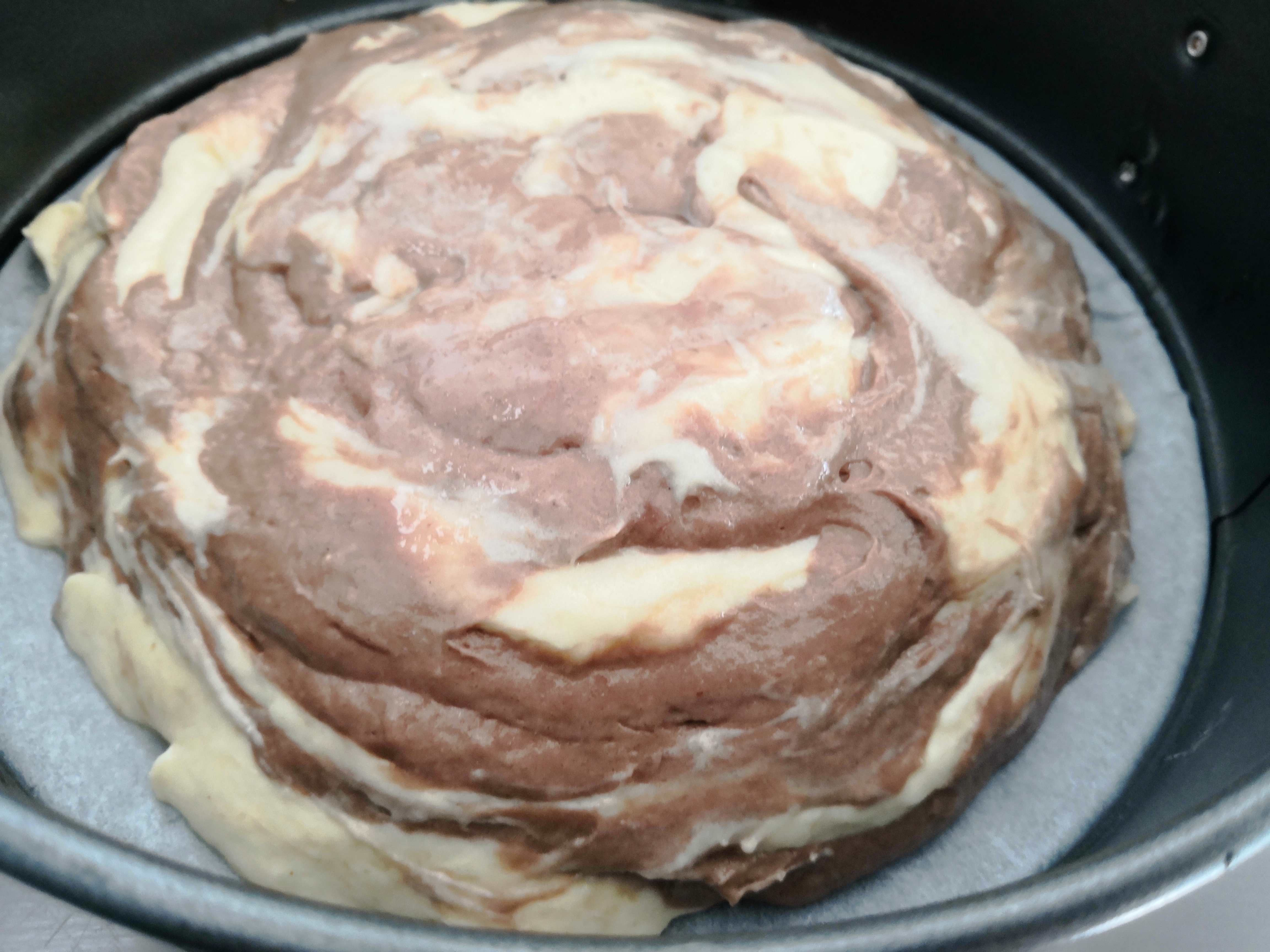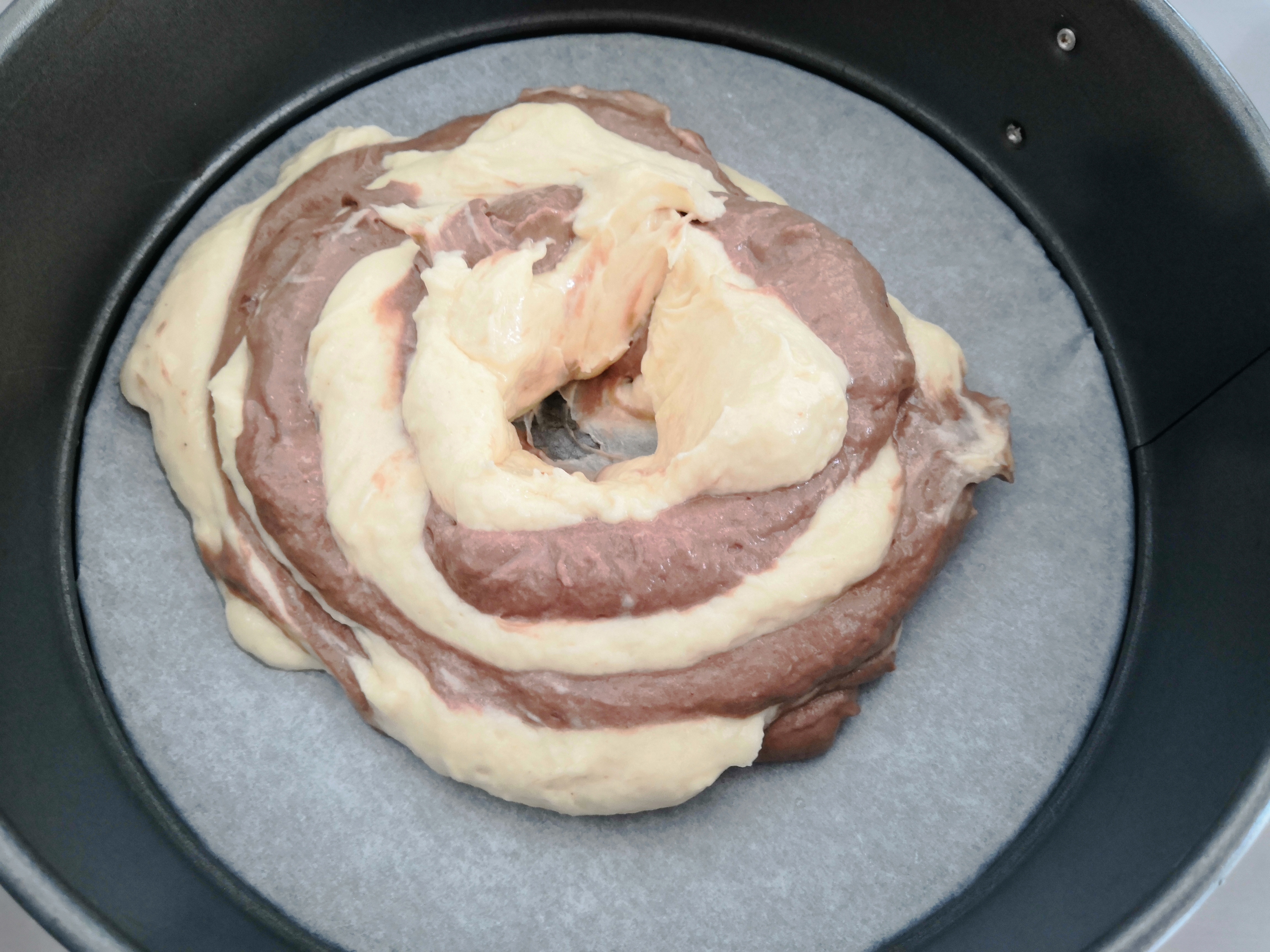- Olajos kanállal a forma középre kanalazunk a fehér tésztából, aminek a közepére kis lyukat fúrunk a kanállal. Ebbe teszünk egy kanál barna tésztát…. Ezt folytatjuk amíg el nem fogy a két tészta.