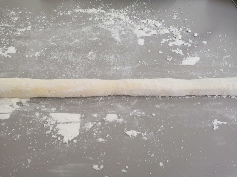 - A tésztát 4 egyenlő részre osztjuk és kb 2 cm átmérőjű rudakat sodrunk belőlük