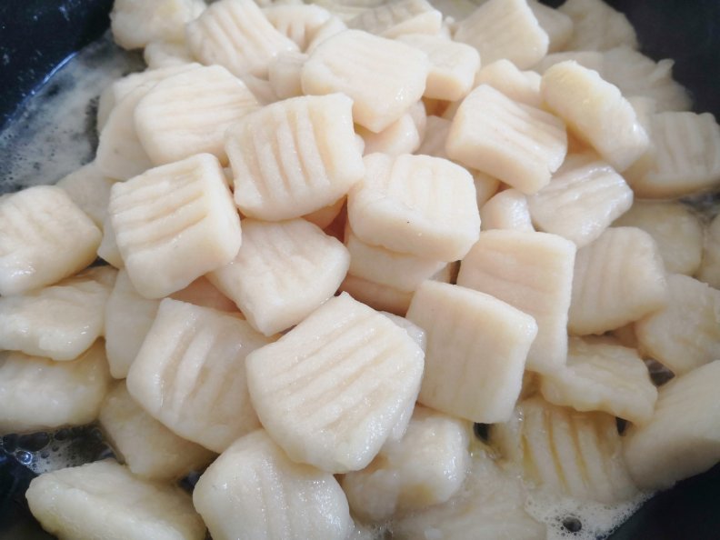 - Bő, forrásban lévő vízbe tesszük a gnocchit. Amikor feljön a víz tetejére, leszűrjük és hideg vízzel átmossuk.