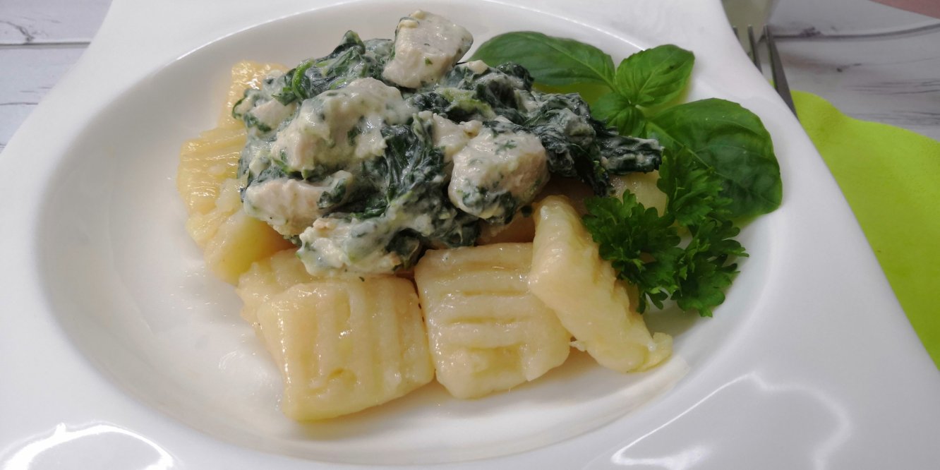 A spenótos csirkemellhez a húst felkockáztam, fokhagymával lepirítottam, fűszereztem sóval, borssal. Hozzákevertem a spenótot, nyakonöntöttem dr Oetker vega cremmel és felforraltam. Megszórtam apróra vágott petrezselymmel és a forró margarinon megforgatott gnocchival tálaltam.
