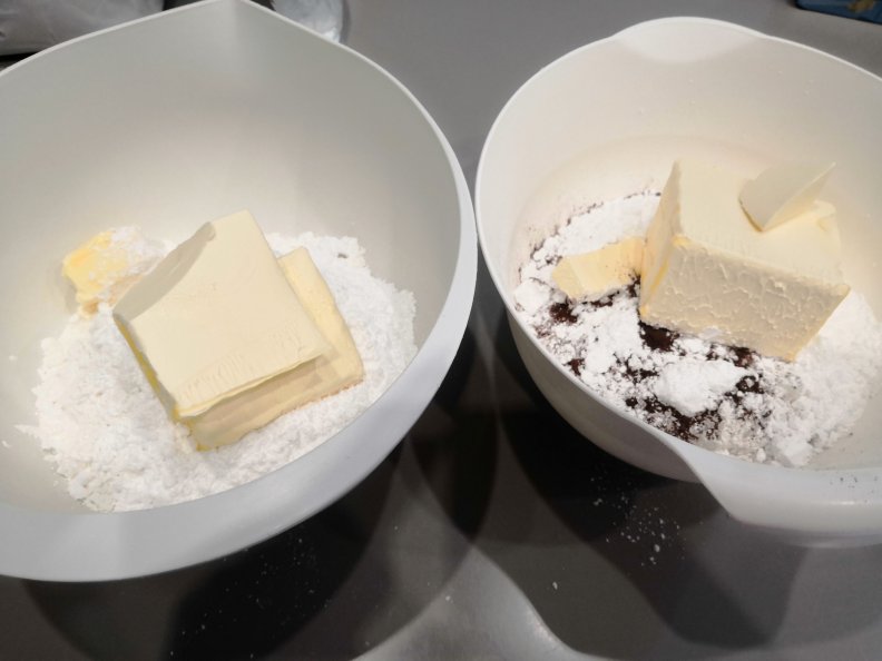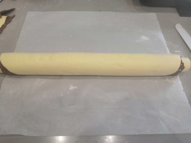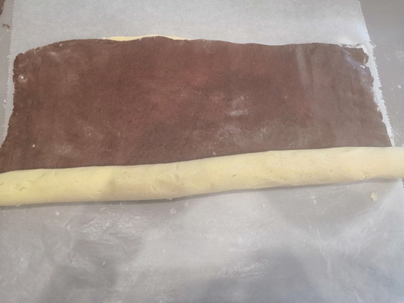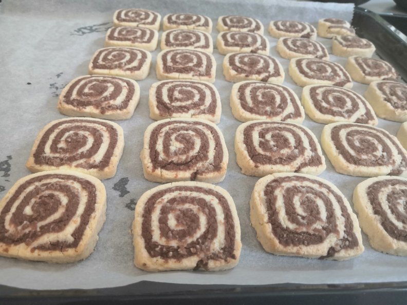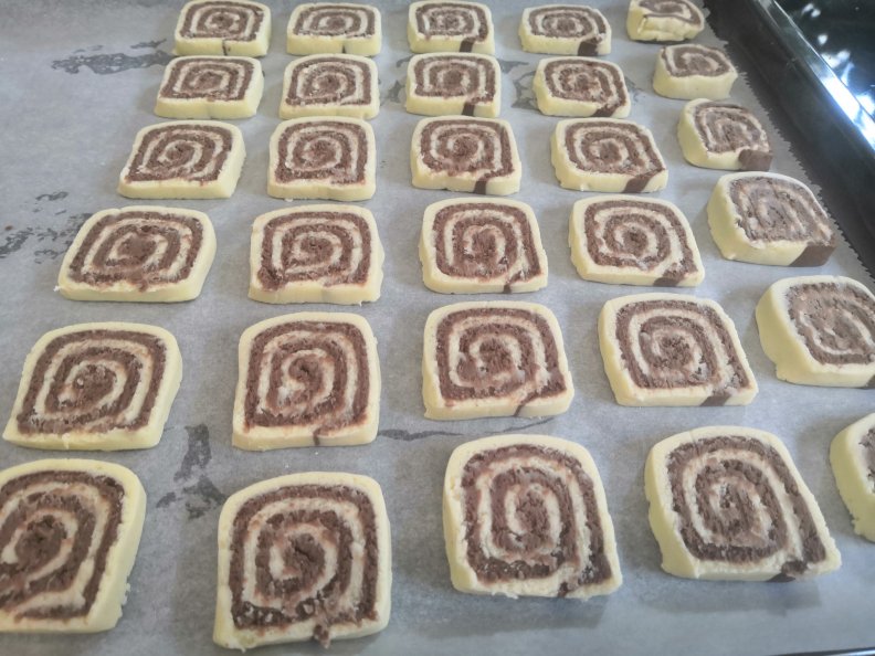 A kekszhez a hozzávalókat összegyúrjuk és mindkét tésztát egyenlő nagyságú, vékony téglalapra nyújtjuk. A fehér tésztára tesszük a barnát, szorosan feltekerjük, vékonyra szeleteljük. Sütőpapírral bélelt tepsibe tesszük és 190 fokra előmelegített sütőben kb 10 percet sütjük.