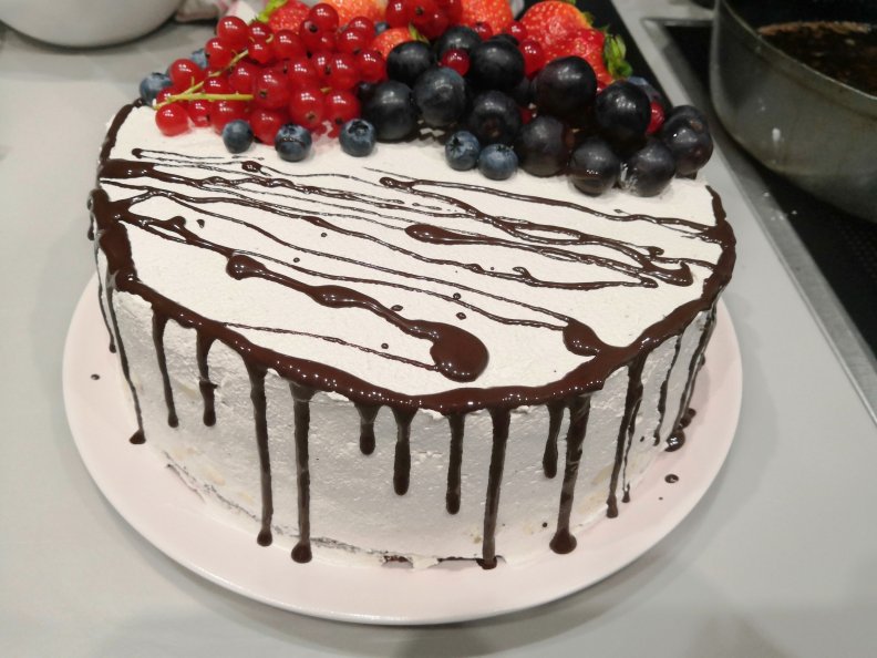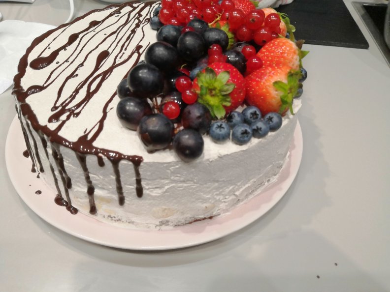 Ízlés szerint díszítjük a tetejét gyümölccsel és olvasztott csokival (az olvasztott csokiba keverjük a pici olajat)