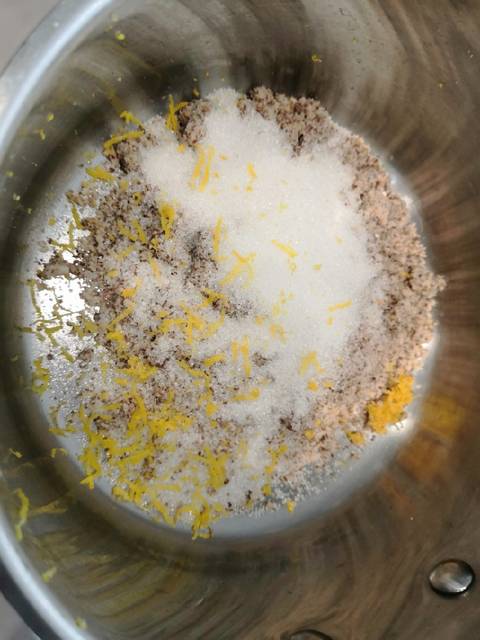 Mandulás töltelék: a mandulát, cukrot, reszelt citrom héját összekeverjük, hozzáadjuk a tejet és 1-2 percet főzzük, majd lehűtjük.
