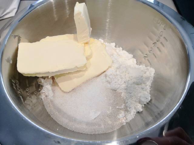 A tészta száraz hozzávalóit egy keverőtálba mérjük és elmorzsoljuk a margarinnal. Hozzáadjuk a tejet és rugalmas tésztát gyúrunk belőle. Amíg elkészül a töltelék, a tésztát hagyjuk kelni.
