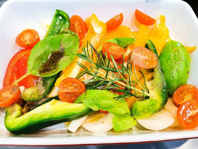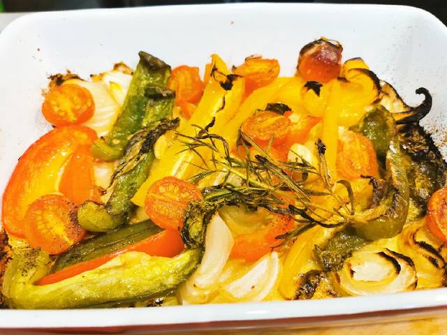 A paprikákat megmossuk, csíkokra, a paradicsomot félbe vágjuk. A hagymát és fokhagymát nagyobb darabokra vágjuk. Tűzálló tálba tesszük a zöldségeket, meglocsoljuk olíva olajjal, ízlés szerint fűszerezzük és 200 fokon kb 20 percet grillezzük.