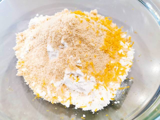 A cukrot, a liszteket, a citrom reszelt héját keverjük össze és morzsoljuk el a margarinnal.