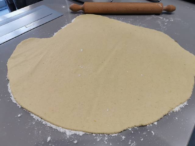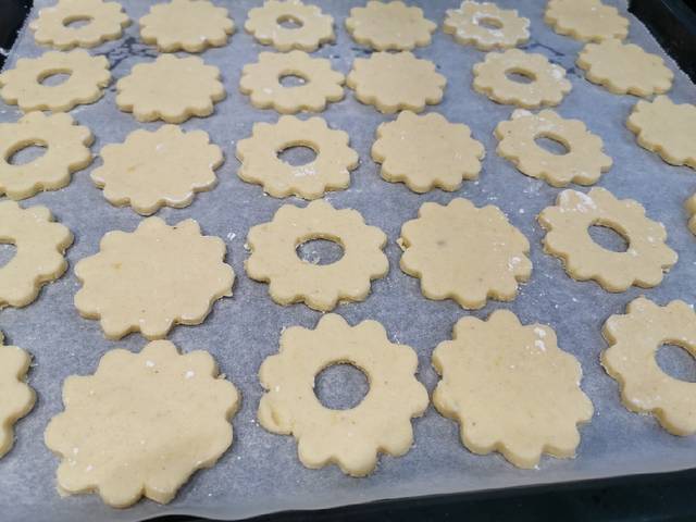 2-3 mm vastagra nyújtsuk ki és tetszés szerint szaggassuk. Tegyük sütőpapírral bélelt tepsibe.