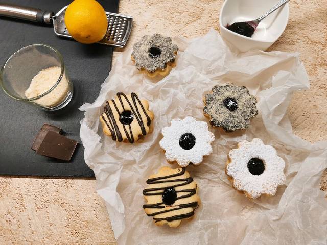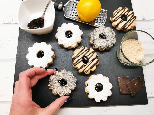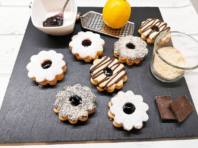 A mandula, a citrom és az erdei gyümölcs lekvár tökéletesen egészítik ki egymást ebben a linzerben.