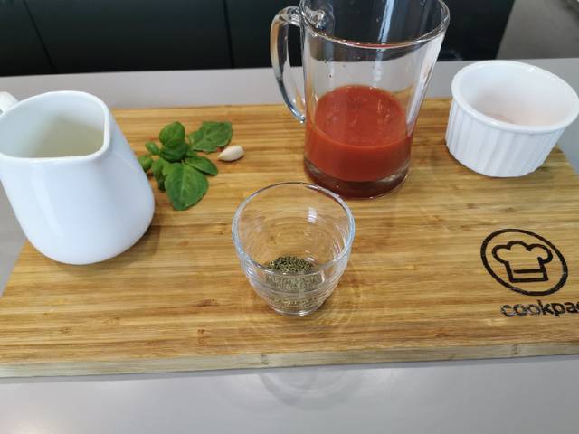 Közben készítsük el a paradicsomos szószt. A paradicsomlevet, a sót, fokhagymát, bazsalikomot, oregánót tegyük egy edénybe és botmixerrel habosítsuk fel az olajjal.