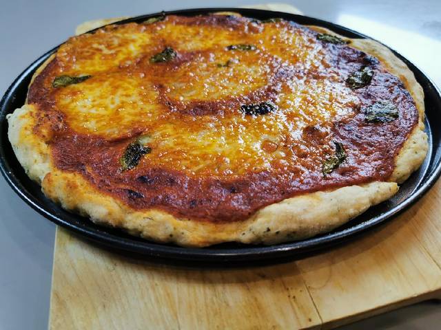 A megkelt tésztát nyújtsuk kör alakúra és tegyük pizza sütőre. (az én pizza sütőm 29 cm). Kenjük meg a paradicsomos szósszal, halmozzunk rá karikára vágott mozzarellát, szórjuk meg gazdagon bazsalikom levéllel.