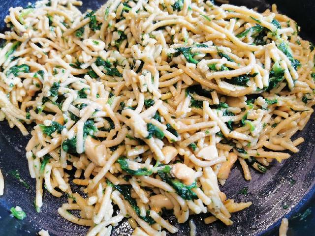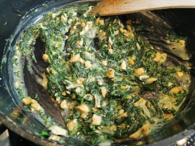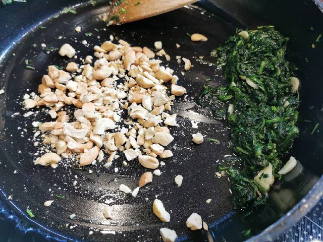 Keverjük a fokhagymához a fűszernövényeket és a spenótot, majd pár percig folyamatosan kevergetve pároljuk. Közben vágjuk durvára a kesudiót és tegyük a serpenyőbe.