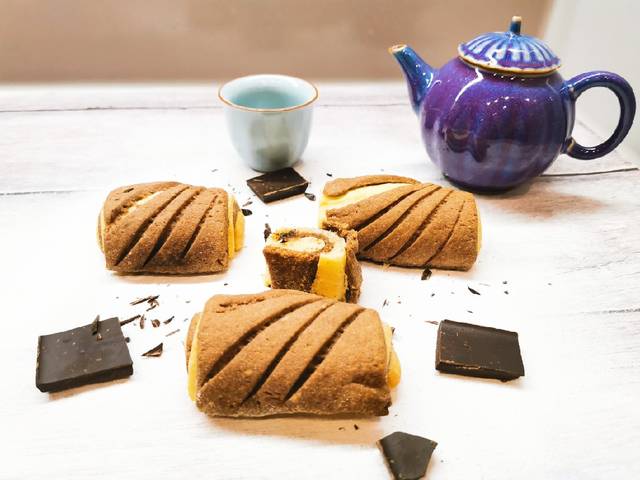 A tésztája apró változtatásokkal egy bejgli tészta, aminek a felébe kakaót gyúrtam.
