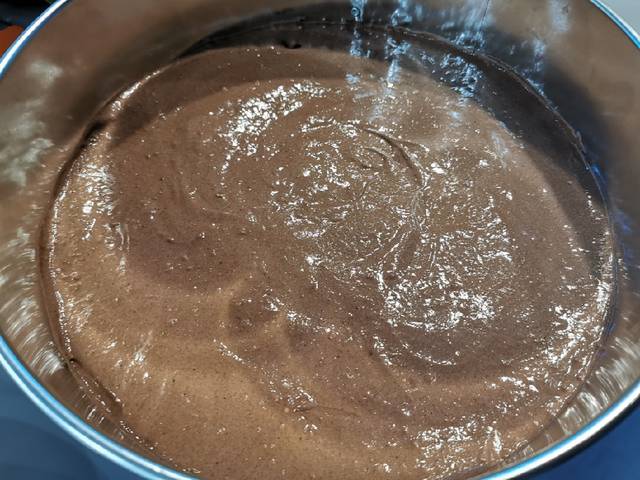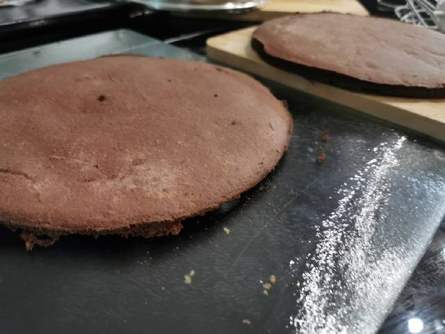 Piskóta: egy keverőtálban összekeverjük az összes száraz hozzávalót, hozzáadjuk a tejet, a tejszínt és alaposan összekeverjük. Két részre osztjuk, sütőpapírral bélelt 24 cm-es tortaformába tesszük az egyik felét és 180 fokra előmelegített sütőben 20 percet sütjük. Utána ugyan így megsütjük a másik lapot is.