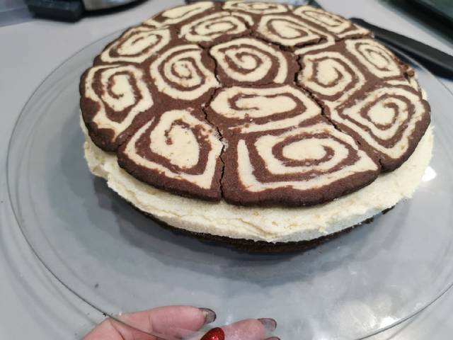 Két piskóta réteg rengeteg krémet és csiga keksz lapot rejt.