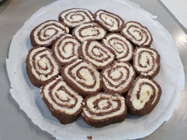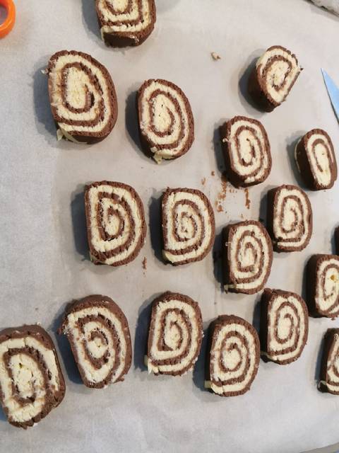 A keksz hozzávalóit kimérjük 1-1 tálba és rugalmas tésztát gyúrunk belőlük. A fehér és a barna tésztából is kb. 3 mm vastag, ugyan akkora téglalapokat nyújtunk, egymásra fektetjük őket és felcsavarjuk. Ujjnyi vastag csigákat vágunk belőle